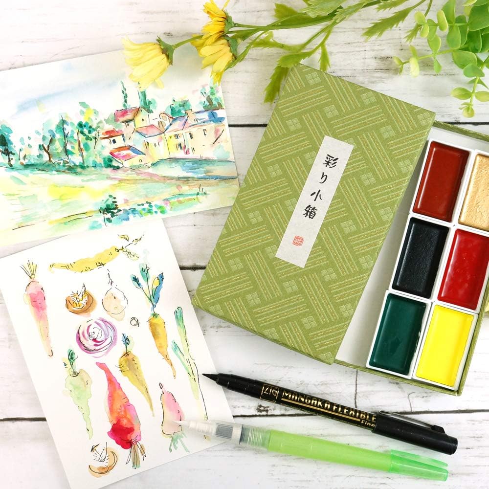 • [IRODORI KOBAKO GREEN PORTABLE SET] Includes the essential tools you need to draw a picture, all in a compact green colored Washi-paper box! Each set is packed with 6 Gansai Tambi paint colors, as well as travel-sized brush pen (MANGAKA Flexible Fine) and a water brush pen (Medium size).