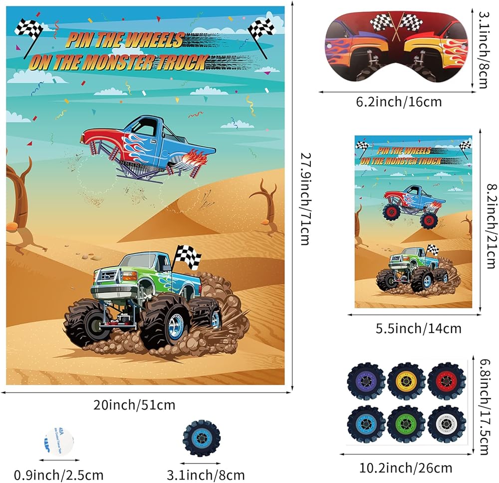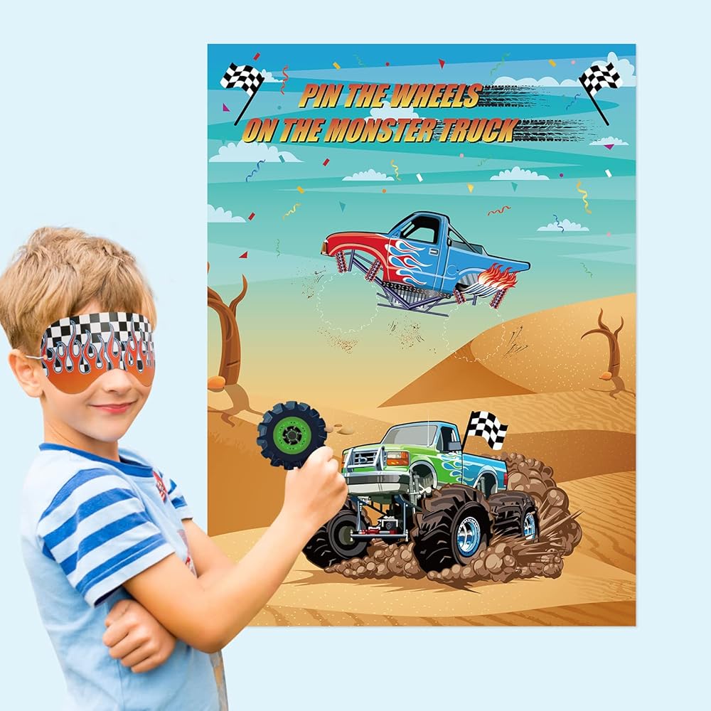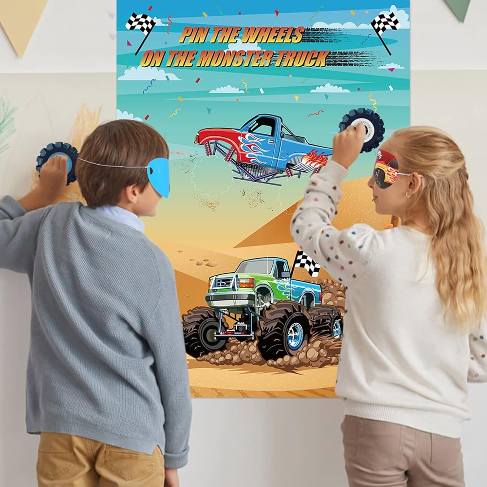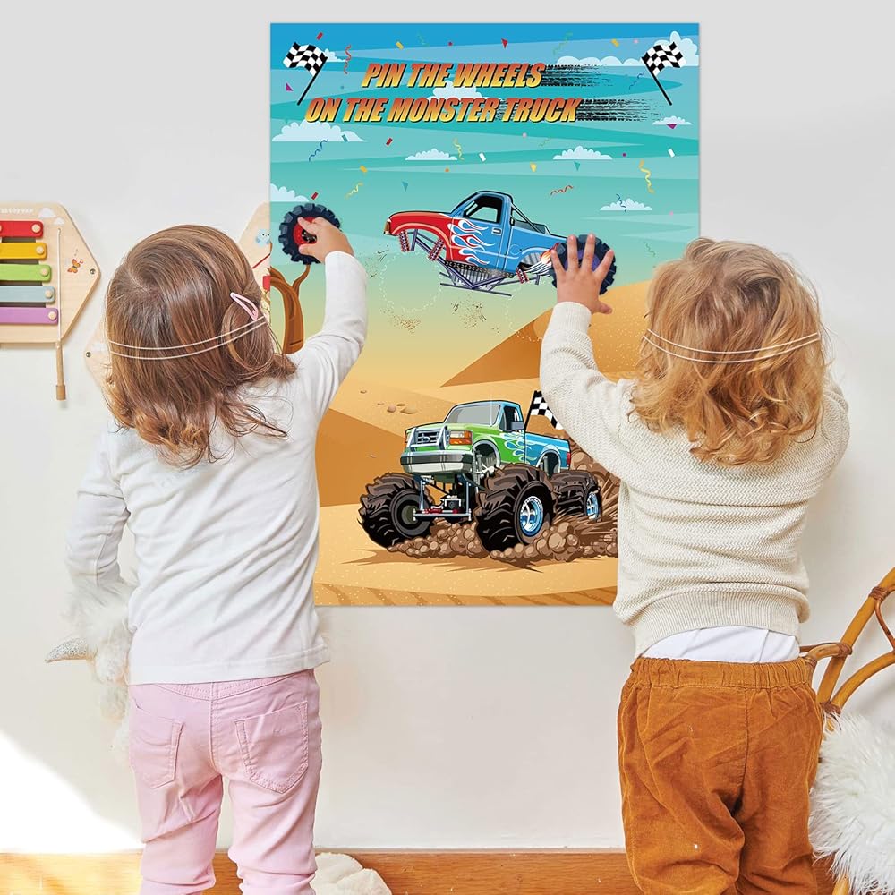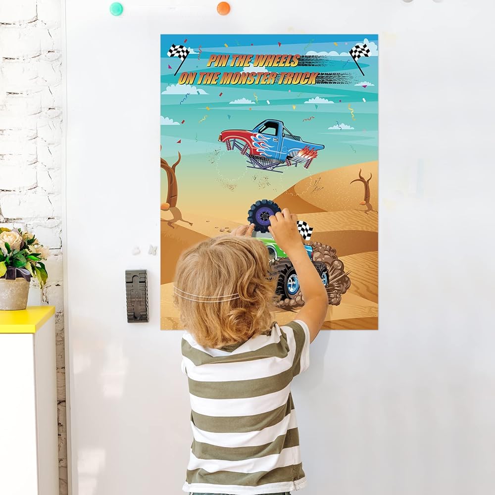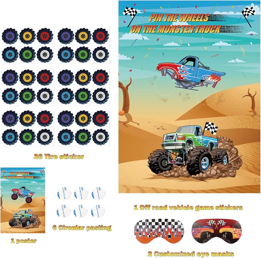 Hxezoc Pin The Wheels on the Truck Game مع 36 PCS عجلات كبيرة لحفلات الشاحنة لحفلات الشاحنة