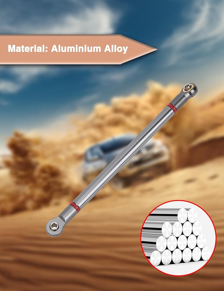 مادة سبيكة الألمنيوم الممتازة: مصنوعة من سبيكة الألمنيوم عالية الجودة ، ضمان قضيب ارتباط قاعدة عجلات العجلات لدينا المتانة والموثوقية لسيارتك الزاحف RC. استمتع بالأداء المحسّن وطول العمر مع البناء المتفوق.