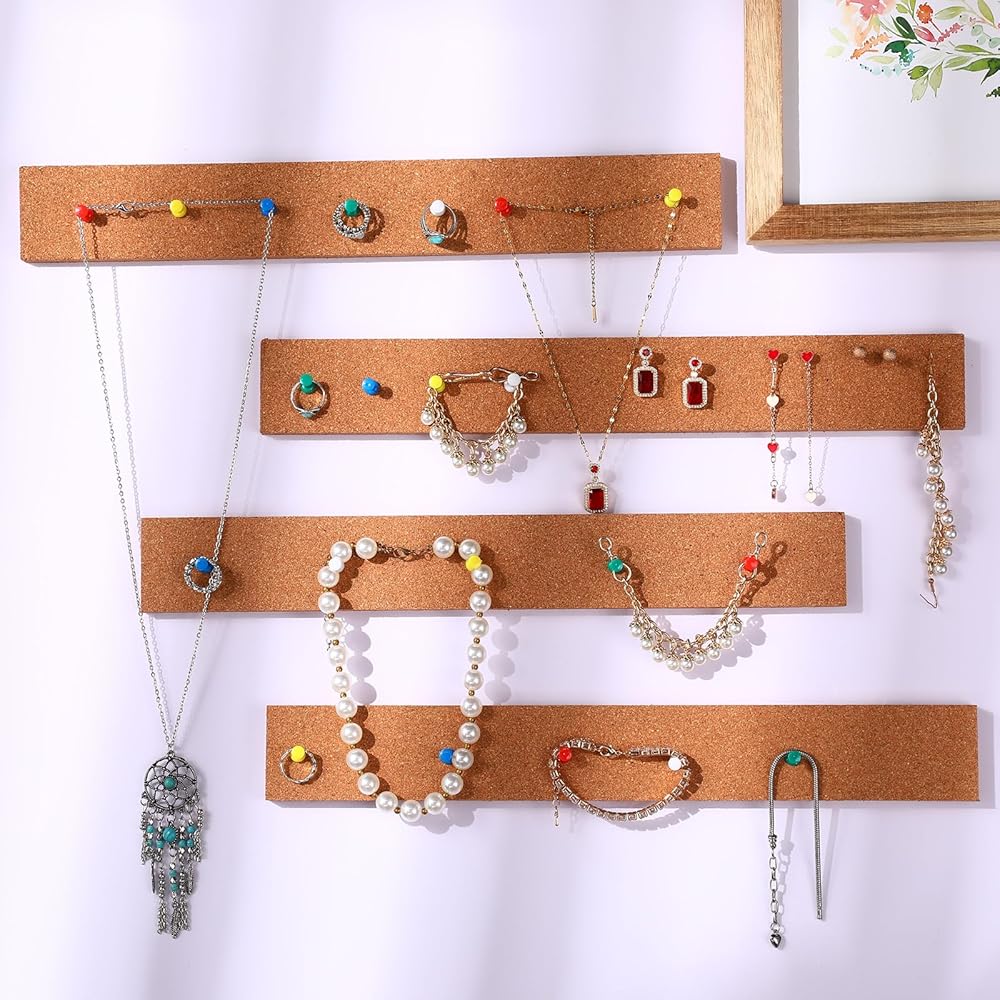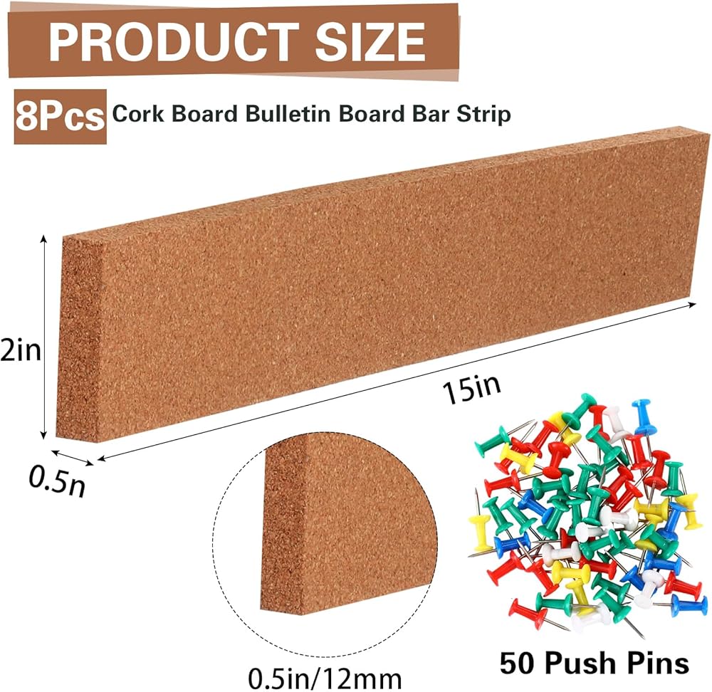 • Satisfy Your Needs: you can get 8 pieces of cork board strips for walls with self adhesive backing and 50 pieces of push pins in this package, you can use them for art display, work, office organization, jewelry display, hanging pictures and calendars, holding business cards, assembling stuff and more, convenient and clean