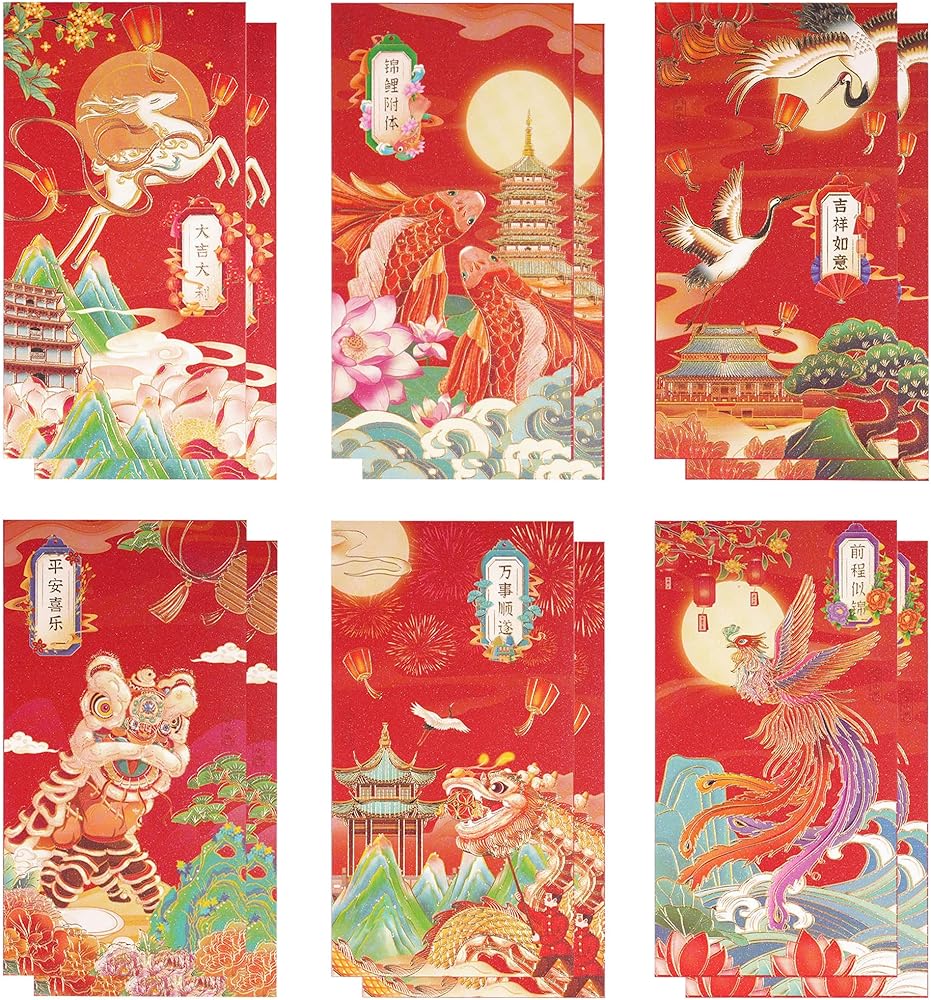 🧧 Chinese red envelopes: 24pcs Chinese New Year envelopes in 6 patterns. The patterns are full of Chinese style, and the colors are gorgeous and colorful. The size of each paper is (16.7*8.8cm) 6.57*3.47 Inches.