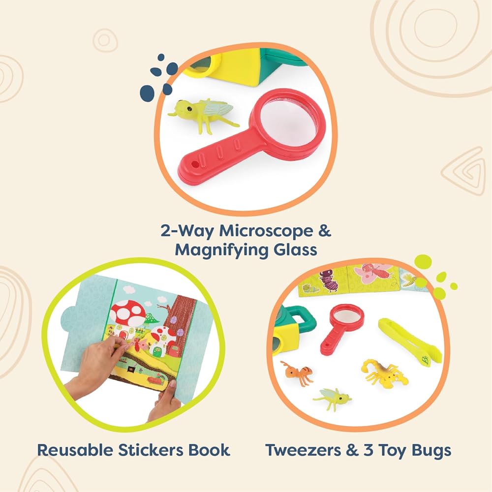 Includes: This science playset comes with a 2-way microscope, magnifying glass, tweezers, and 3 colorful toy critters to explore (type may vary).