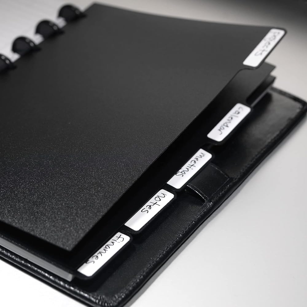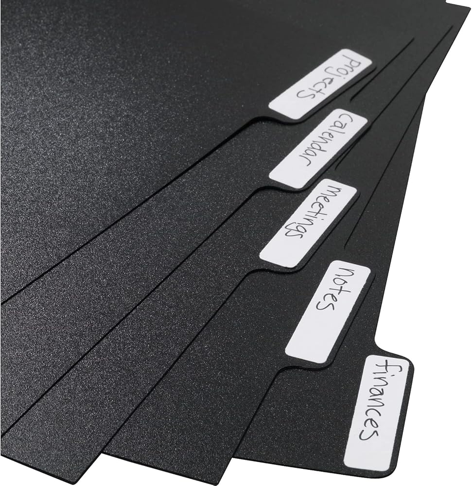 Black tabs with 20 labels. 5 Repositionable poly tab dividers.