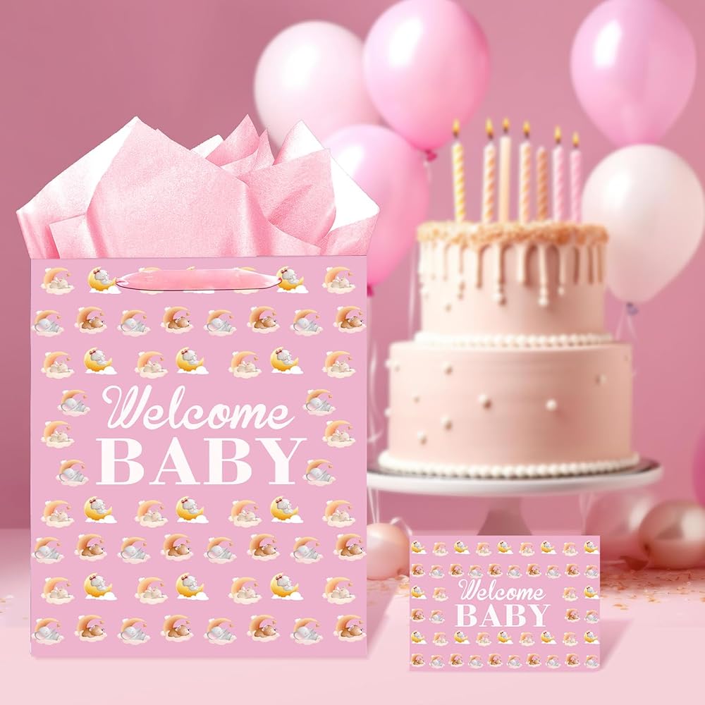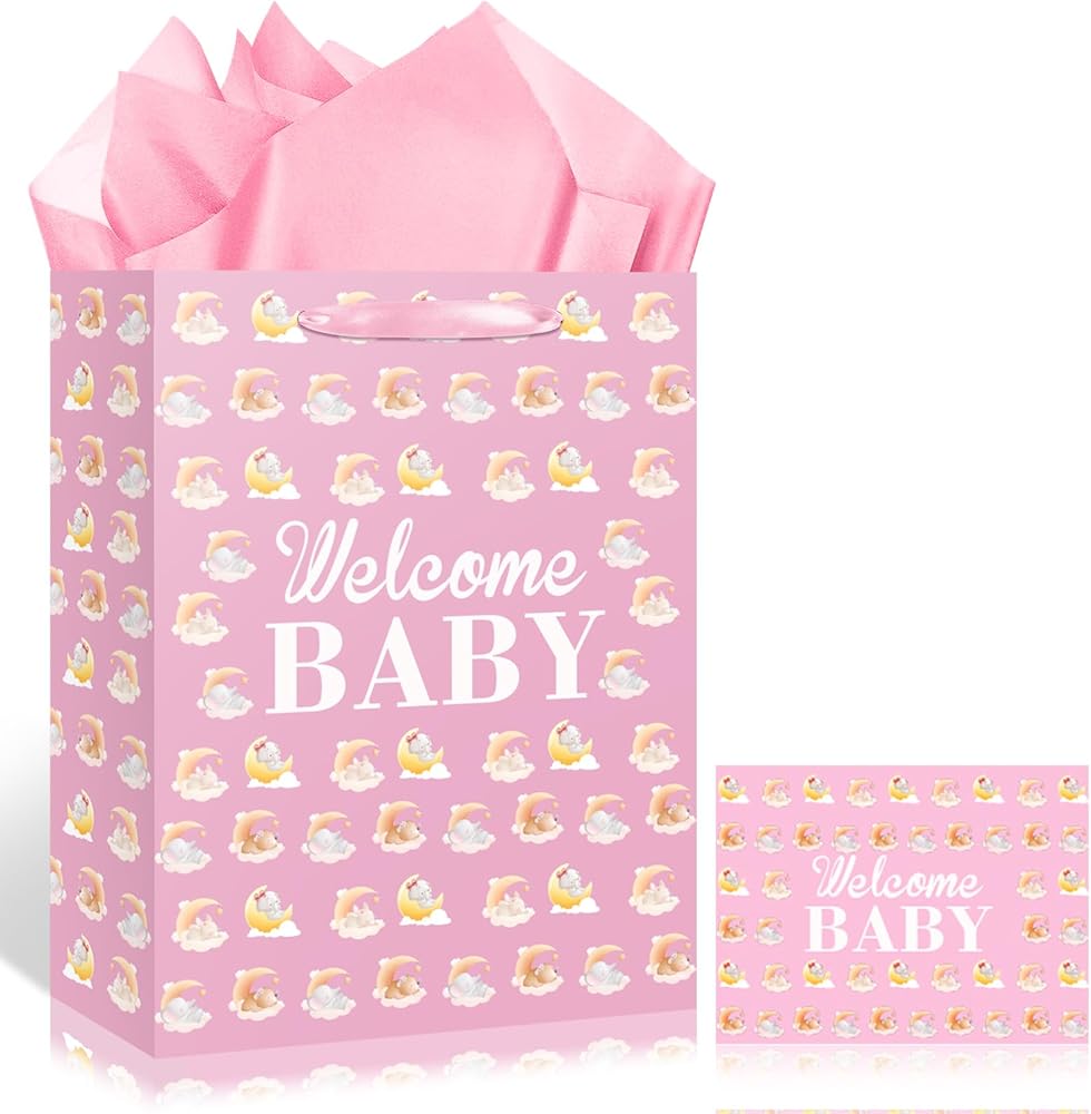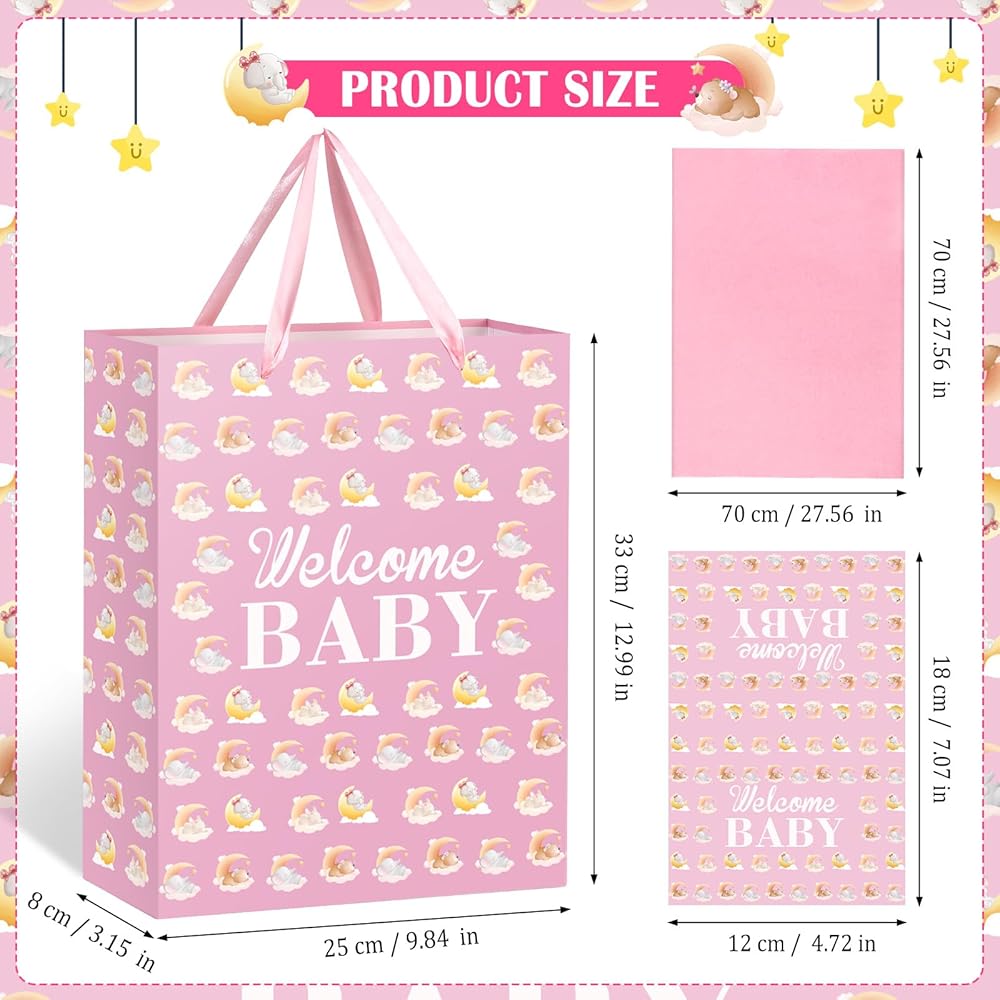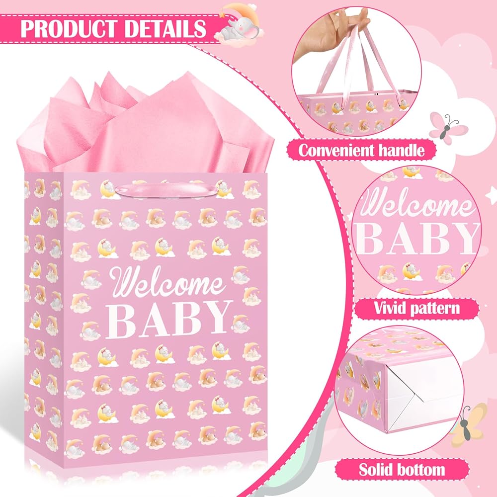 Cute design: The color of this baby gift bag is pink and the large gift bag is printed with cute rabbit, elephant, and bear patterns, and the above is written "Welcome, baby" The combination of letters and animals is fascinating and is very attractive to anyone who receives this gift