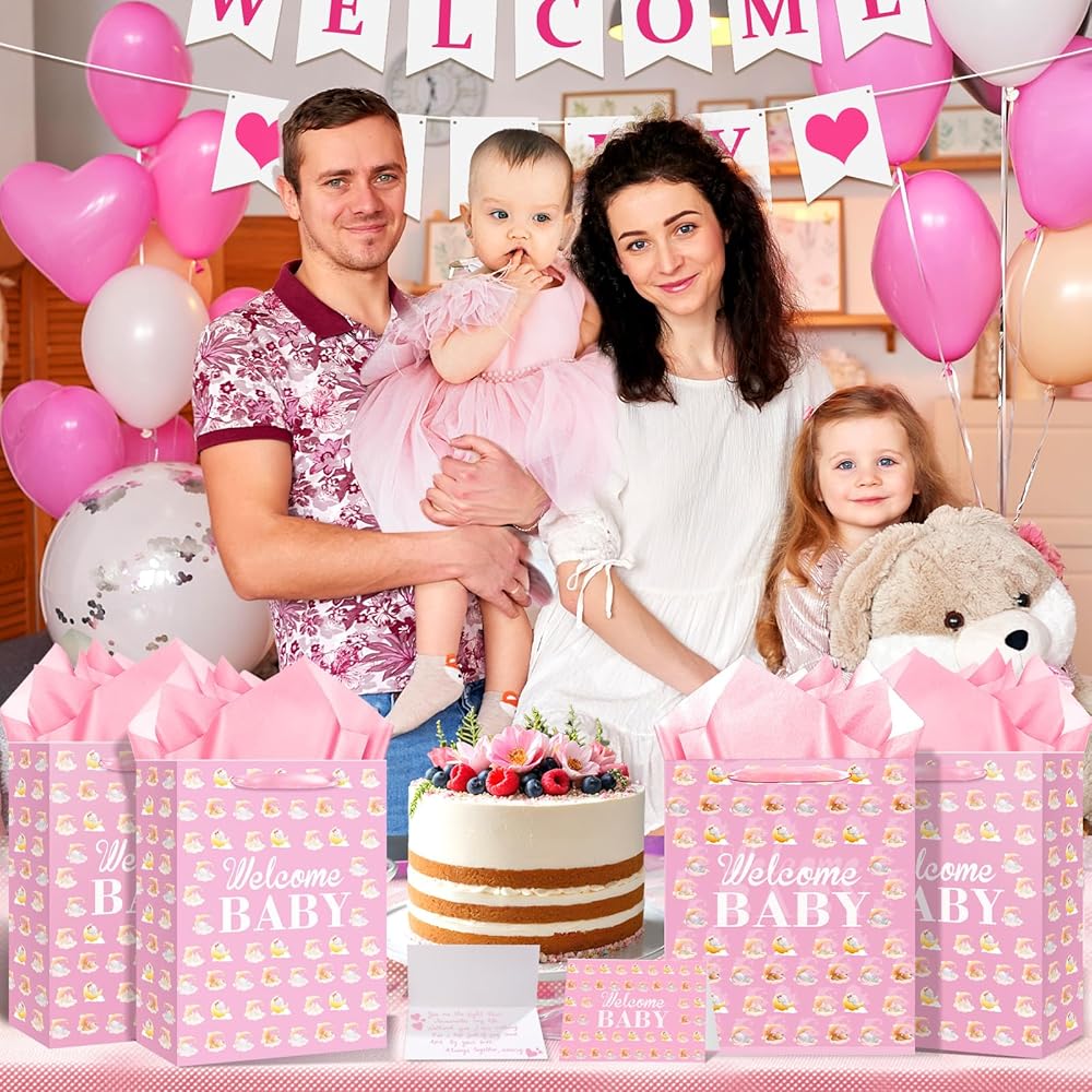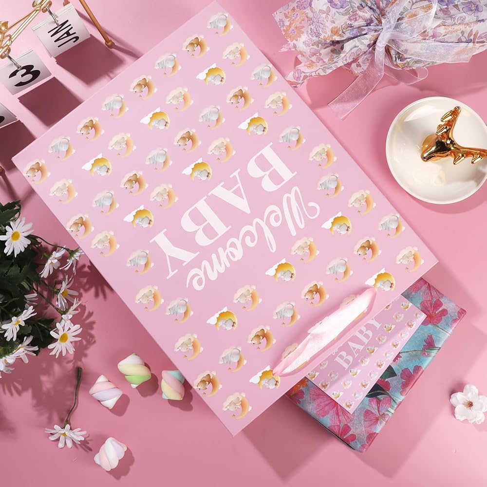 Quality Materials: The large baby girl gift bag with handles is made of thick cardboard and is very durable and solid, with a reinforced bottom to keep your gifts safe. The quality material of the large baby present bag means it can be reused, and it's light so it is easy to carry