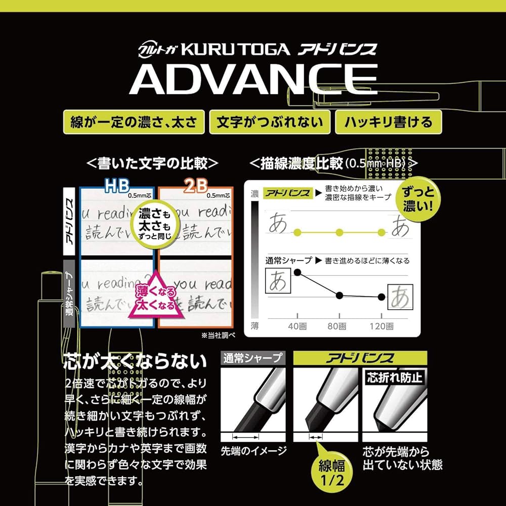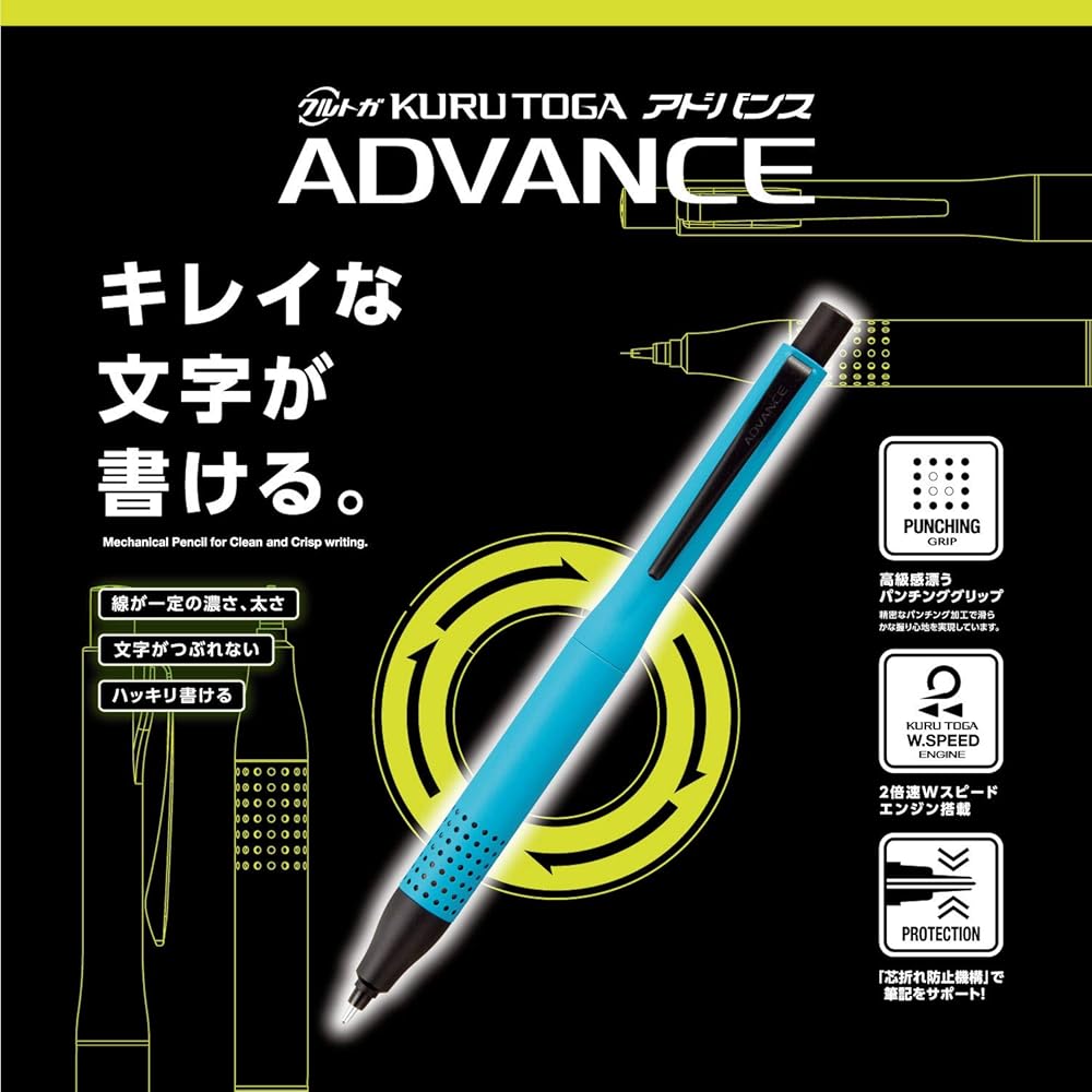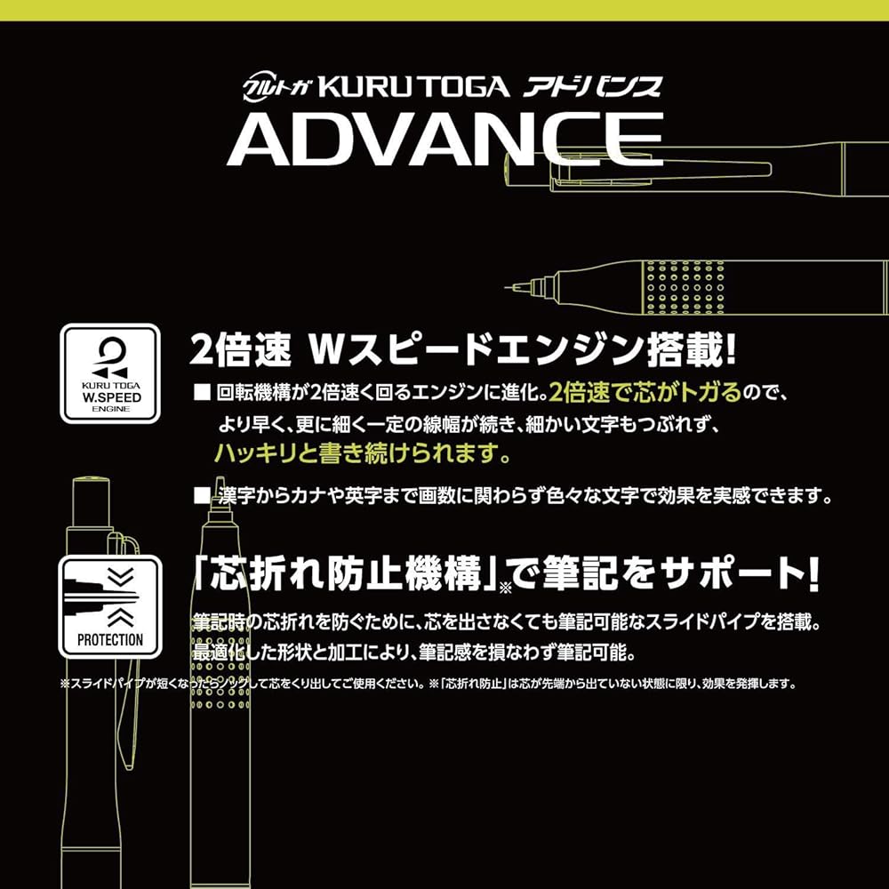New Uni "Kurutoga Advance Upgrade Model" which has improved deseign and shafut materials, has appeared to "Kurutoga Advance" series, which allows you to write beautiful characters with the same darkness and thickness even if you continue to write for a long time. In recent years, students who are the main users of mechanical pencils are particular about performance, functions, design, etc., and have a need to use something better and different. A product that meets such needs is the "Kurtga Advance Upgrade Model". High-precision metal punching grips provide a smooth grip.The double speed "Kurtoga Engine" and metal parts keep the core sharp at double speed, and the line width becomes even faster and narrower. Equipped with a core break prevention mechanism, which prevents core breaks and enables comfortable writing without worrying about writing pressure.