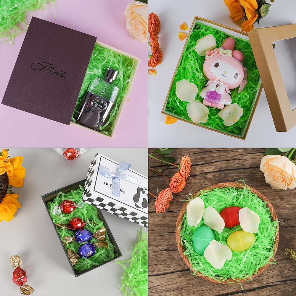 Versatile Usage: Ideal for Holiday & Party Decorations This lightweight and decorative filler is perfect for Easter egg baskets, DIY crafts, and festive gift wrapping. Adds texture, color, and depth to any holiday setup. Ideal Packaging Filler: Soft, Lightweight & Decorative Made from crinkle-cut shredded paper, this filler protects delicate gifts while enhancing presentation. The vibrant green color brings freshness and charm to any gift box or display. Enhance Your Gift's Appeal: Decorative & Stylish A perfect addition to centerpieces, promotional packaging, and store displays. Whether used for gift baskets or festive décor, this filler elevates the visual impact. Multi-Purpose: Expands & Fills Spaces Beautifully Perfect for Easter baskets, wedding favors, fruit hampers, and chocolate boxes. The crepe paper texture creates a full and luxurious look, ensuring better volume and coverage. Add Holiday Charm: Create a Vibrant Seasonal Display Great for Easter, Christmas, and special events. Pair it with banners, balloons, and themed décor to instantly transform any space into a festive celebration.
