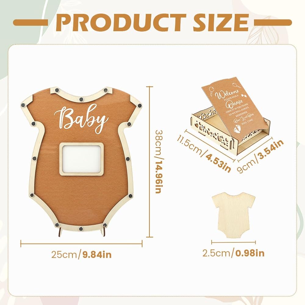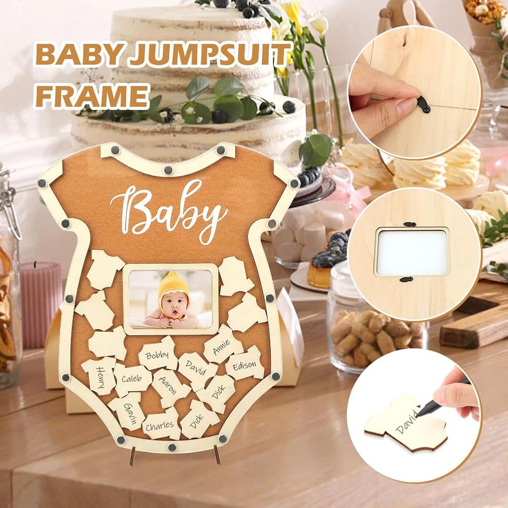 【BABY JUMPSUIT FRAME】Baby shower guestbook frame adopts 3D baby jumpsuit shape, (with stand) is about (L x H)25 x 38cm/9.84 x 14.96inch, features fun and creativ-e designs to decorate a guest book.