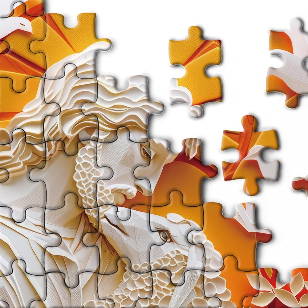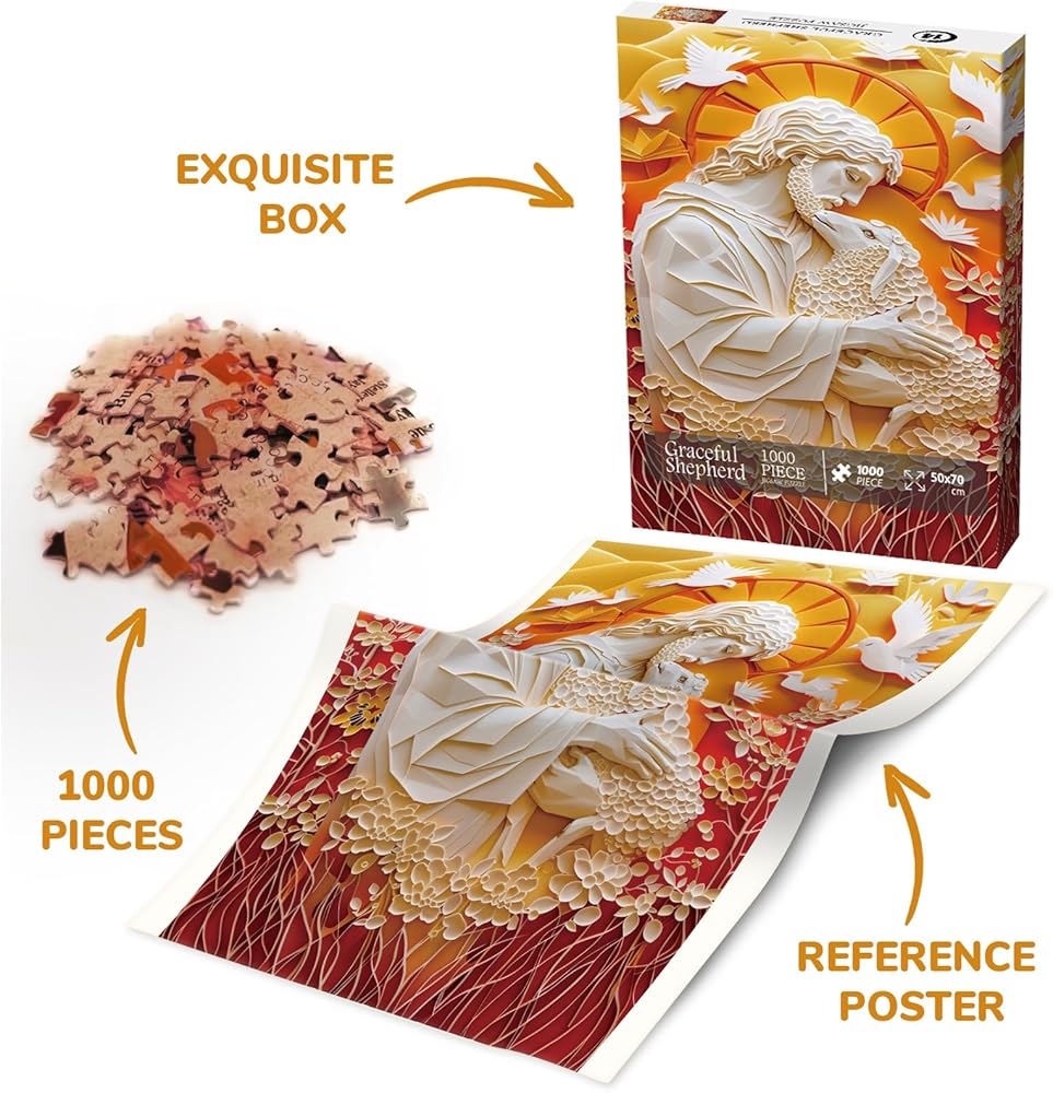 Gentle Shepherd Puzzle: Immerse yourself in the peaceful elegance of our Divine Serenity Puzzle. This beautifully crafted paper-cut art puzzle features Jesus holding a sheep, surrounded by vibrant birds and flowers. Each piece showcases the intricate details of this serene and compassionate scene