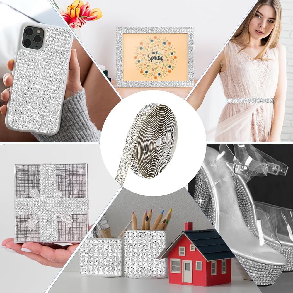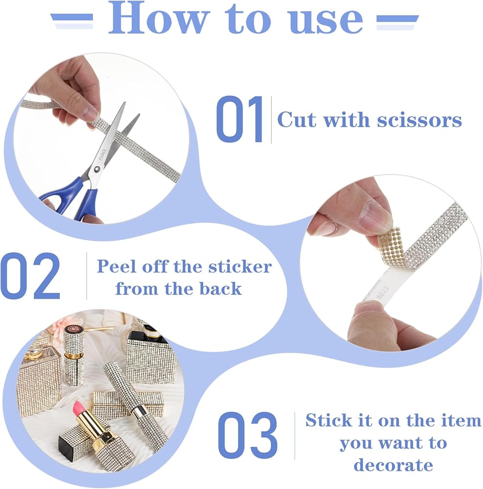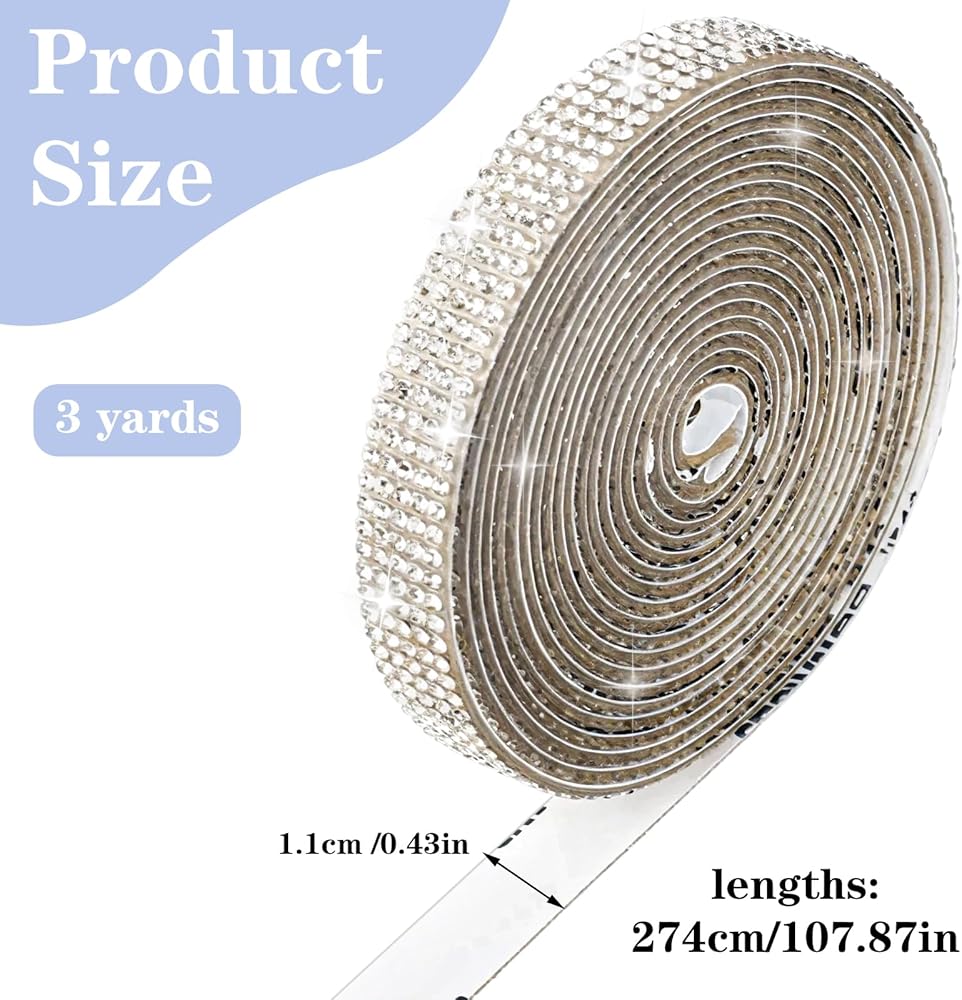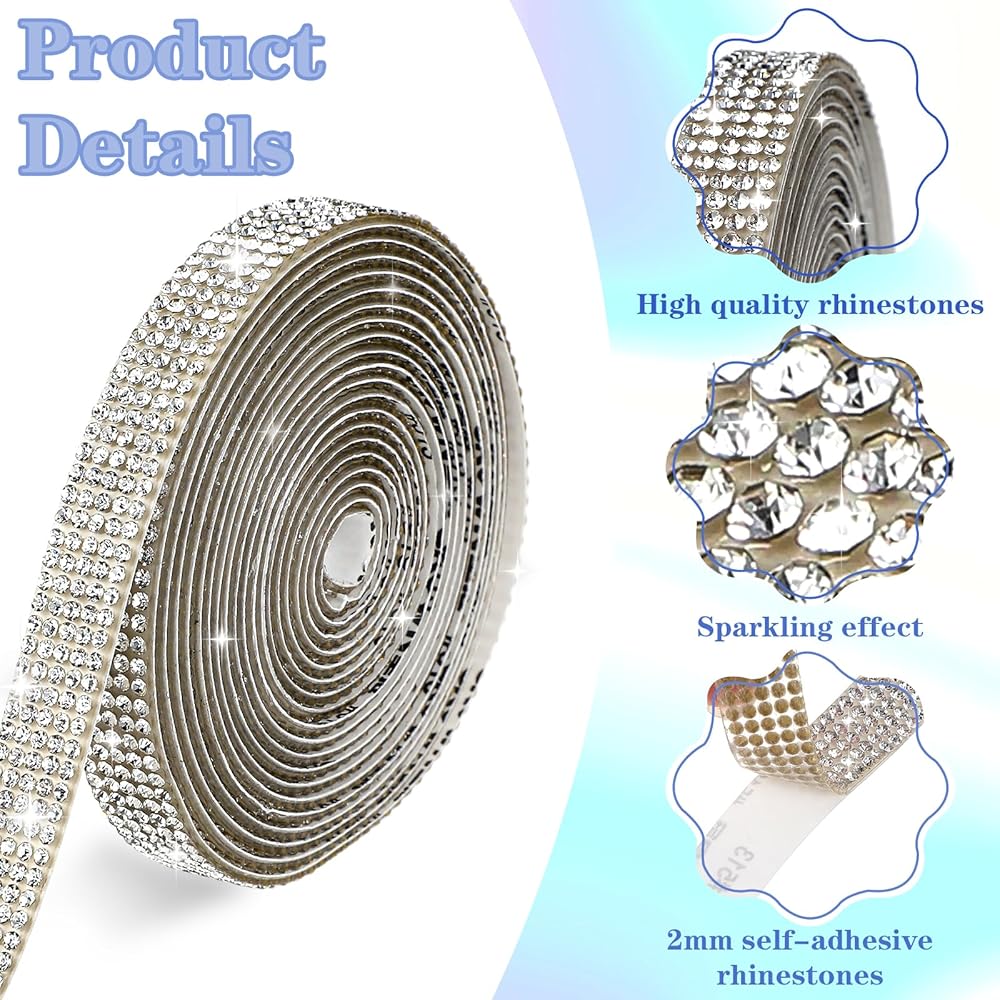 PRODUCT DETAILS: The package includes 1 roll of self adhesive rhinestone ribbon sticker, 0.43 inches wide and 3 yards long, 5 rows 2 mm rhinestone, more practical. There maybe a slight smell after you receiving the goods, please do not worry, it's normal, just leave it for a while.