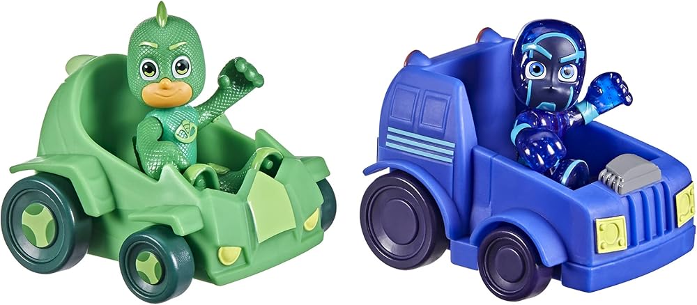 The PJ Masks Gekko vs Night Ninja racers are ready to roll! This awesome vehicle and figure set comes with 2 mini PJ Masks cars and 2 articulating PJ Masks action figures, so kids can pit the Gekko figure and his Gekko-Mobile vehicle and the Night Ninja figure and his Ninja Bus vehicle against each other in epic races. Figures can sit in the vehicles, allowing preschoolers to recreate their favorite scenes from entertainment or imagine new adventures of their own! Figures are compatible with Hasbro Hero ID-equipped PJ Masks playsets (each sold separately, subject to availability), which recognize and react to 3-inch PJ Masks figures with lights, sounds, or both. This PJ Masks toy makes an awesome gift for girls and boys ages 3 and up who love the world of Catboy, Owlette, and Gekko. With the Gekko vs Night Ninja racers, fun is always along for the ride. HASBRO and all related terms are trademarks of Hasbro.