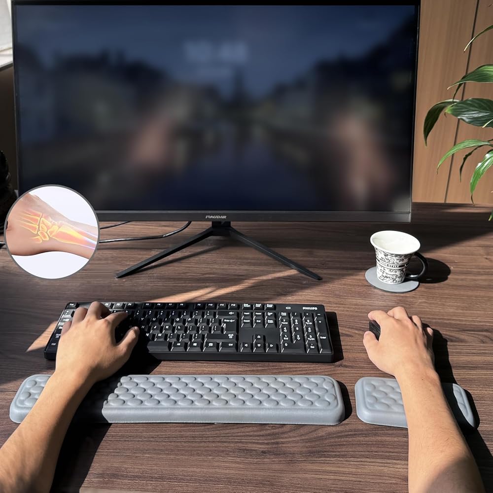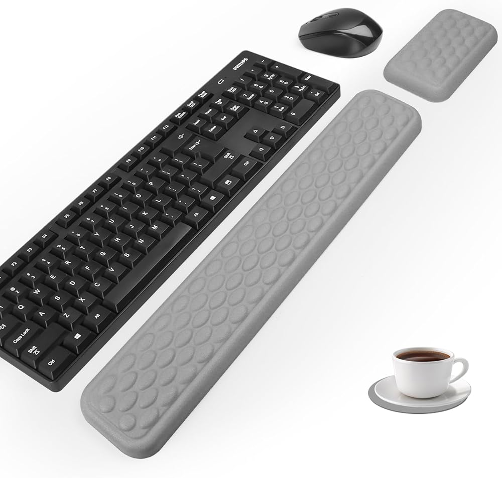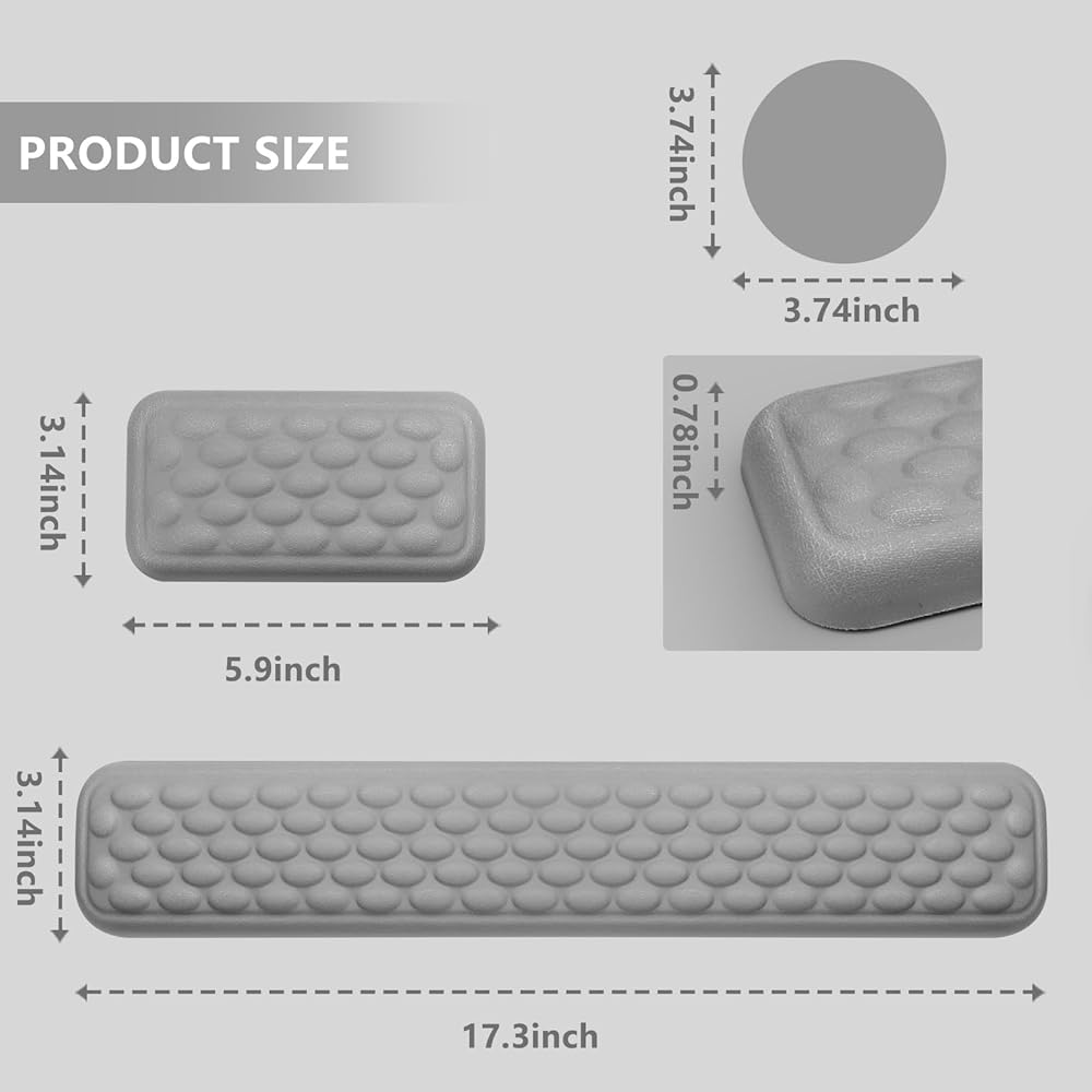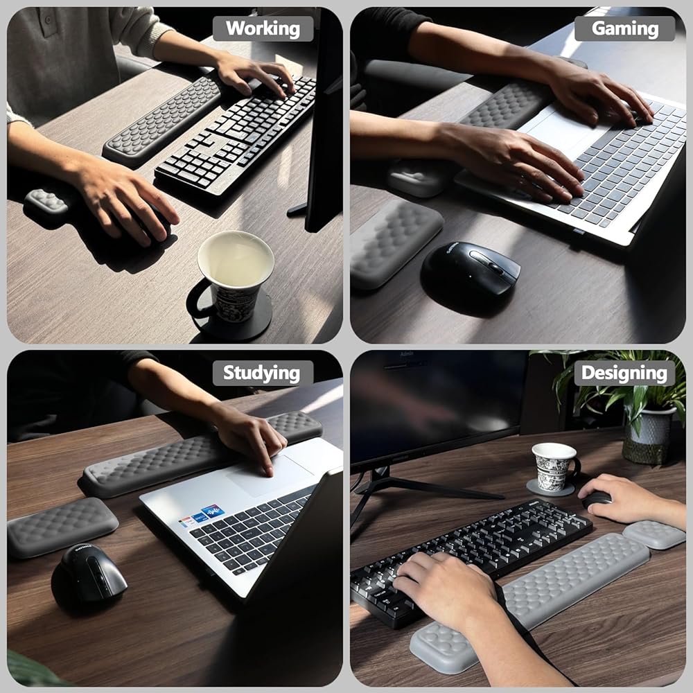【رغوة الذاكرة ذات الكثافة العالية】 لوحة المفاتيح والمعصم الفأر مصنوعة من نسيج حرير الحليب عالي الجودة ومملوءة برغوة ذاكرة عالية الكثافة مع انتعاش سريع ودعم ممتاز ، فإنه يوفر دعمًا ناعمًا وتخفيفًا فعالًا للضغط! مثالي لعمال المكاتب واللاعبين والطلاب والمصممين وغيرهم من مستخدمي الكمبيوتر على المدى الطويل
