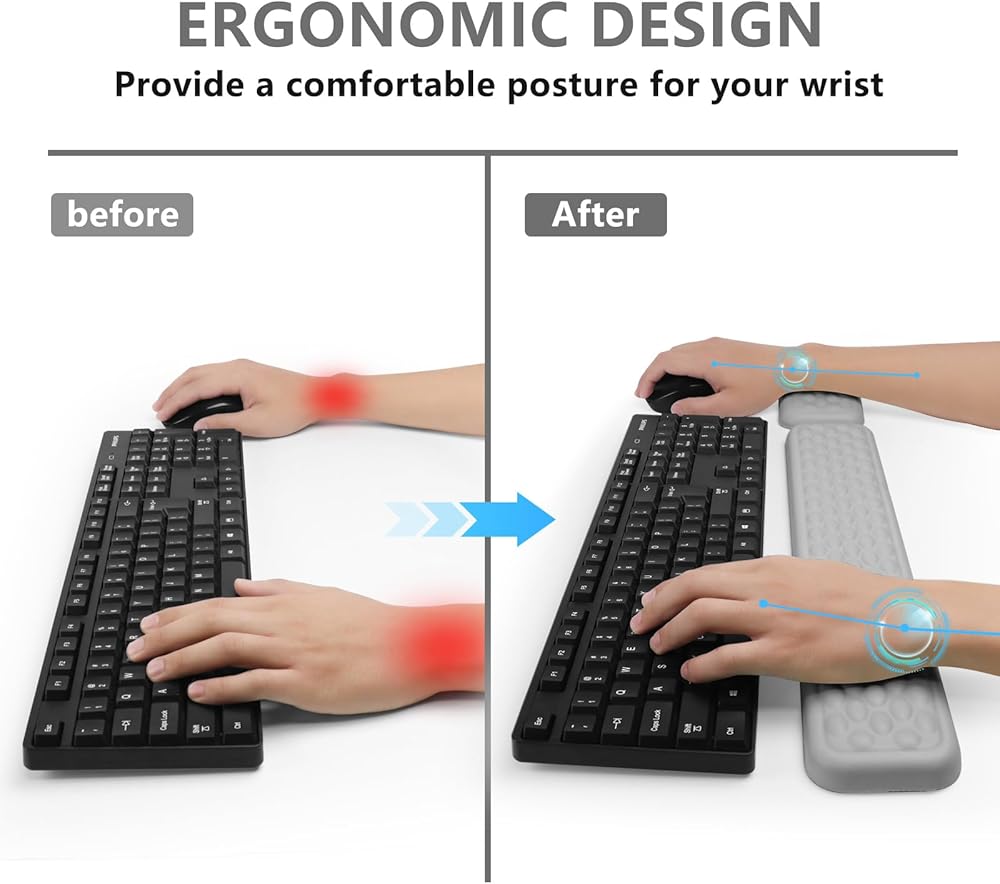【يرتكب المعصم المريح】 لوحة المفاتيح معصم المعصم تصميم شكل معصم مريح يتناسب تمامًا مع معصمك ونخيلك عند وضع معصمك على راحة معصم الماوس ، يحسن راحة معصم الكمبيوتر في وضع اليدين والمعصم ويطلق الضغط على المرفقين والكتفين خلال ساعات طويلة من استخدام الكمبيوتر.