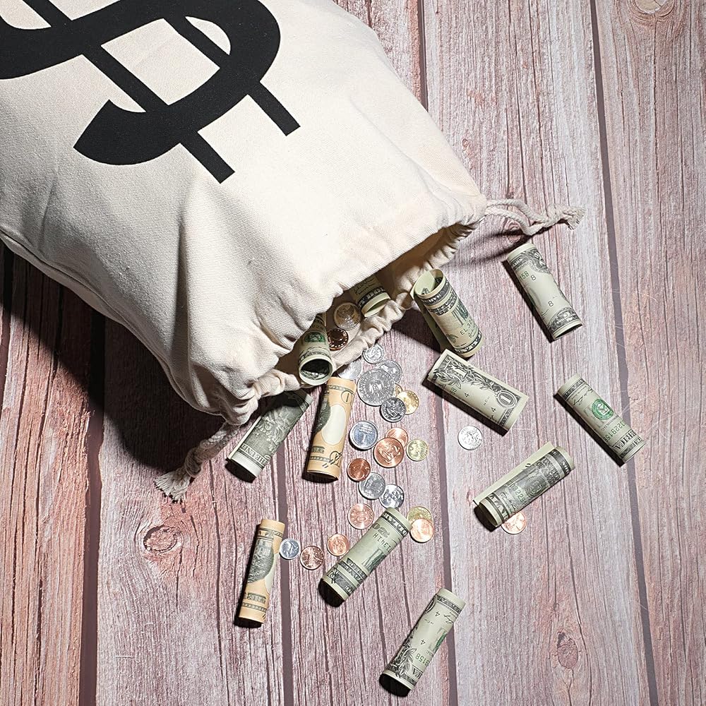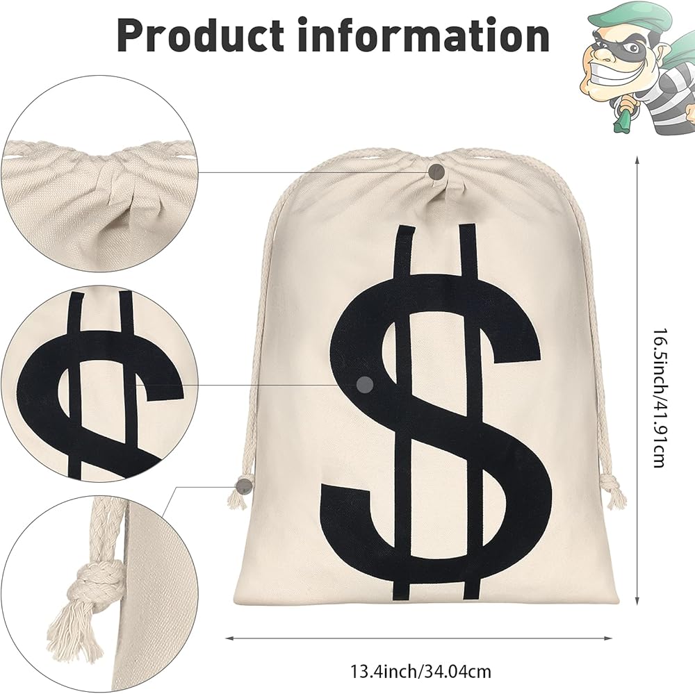 • Drawstring pouch: printed with black dollar sign and made of canvas, the money drawstring pouch is strong and stable, not easy to break, its attached drawstring brings convenience to carry, it's approx. 34 x 42 cm/ 13.39 x 16.54 inches, big enough to accommodate various small props, it's not only good for cosplay parties, but also great for daily use