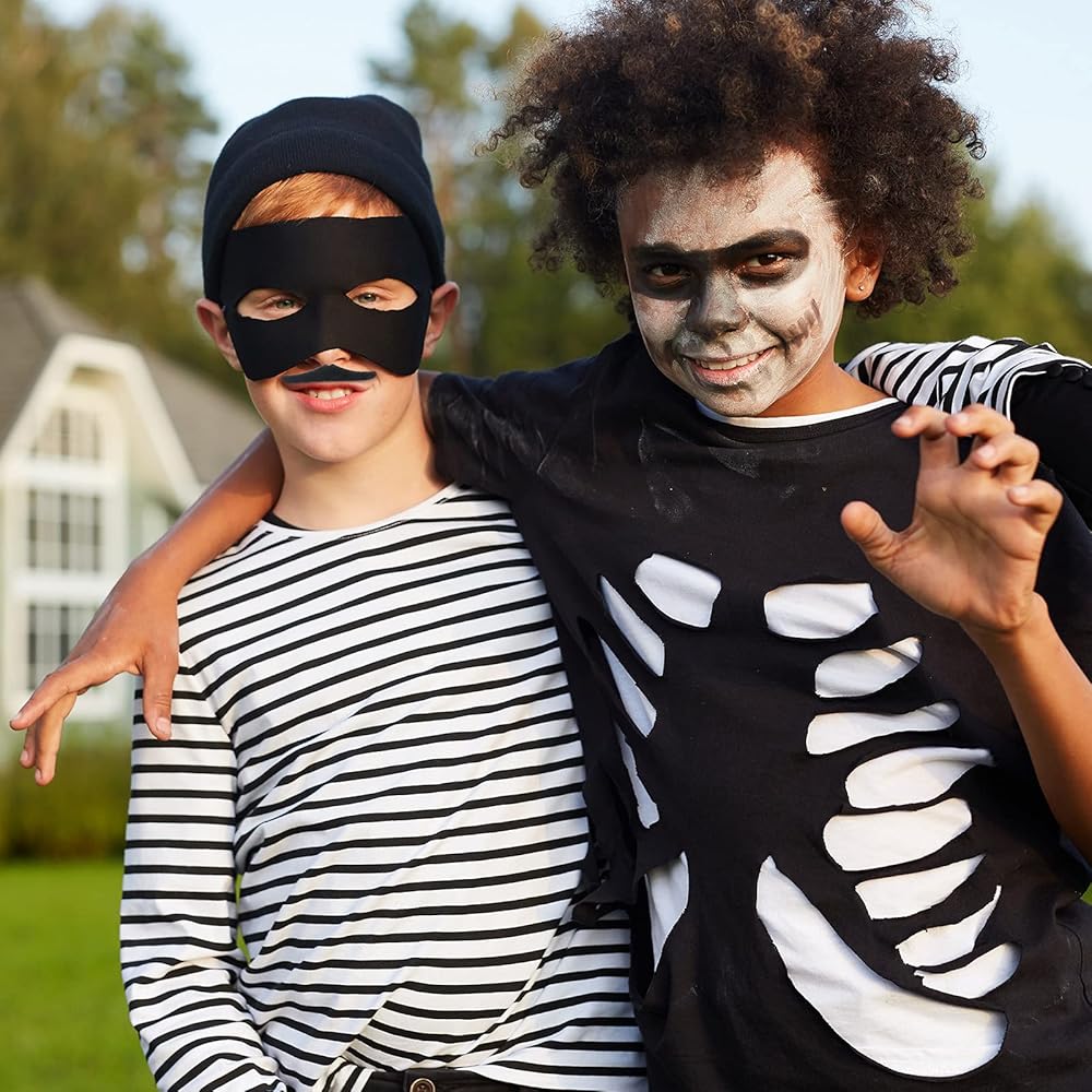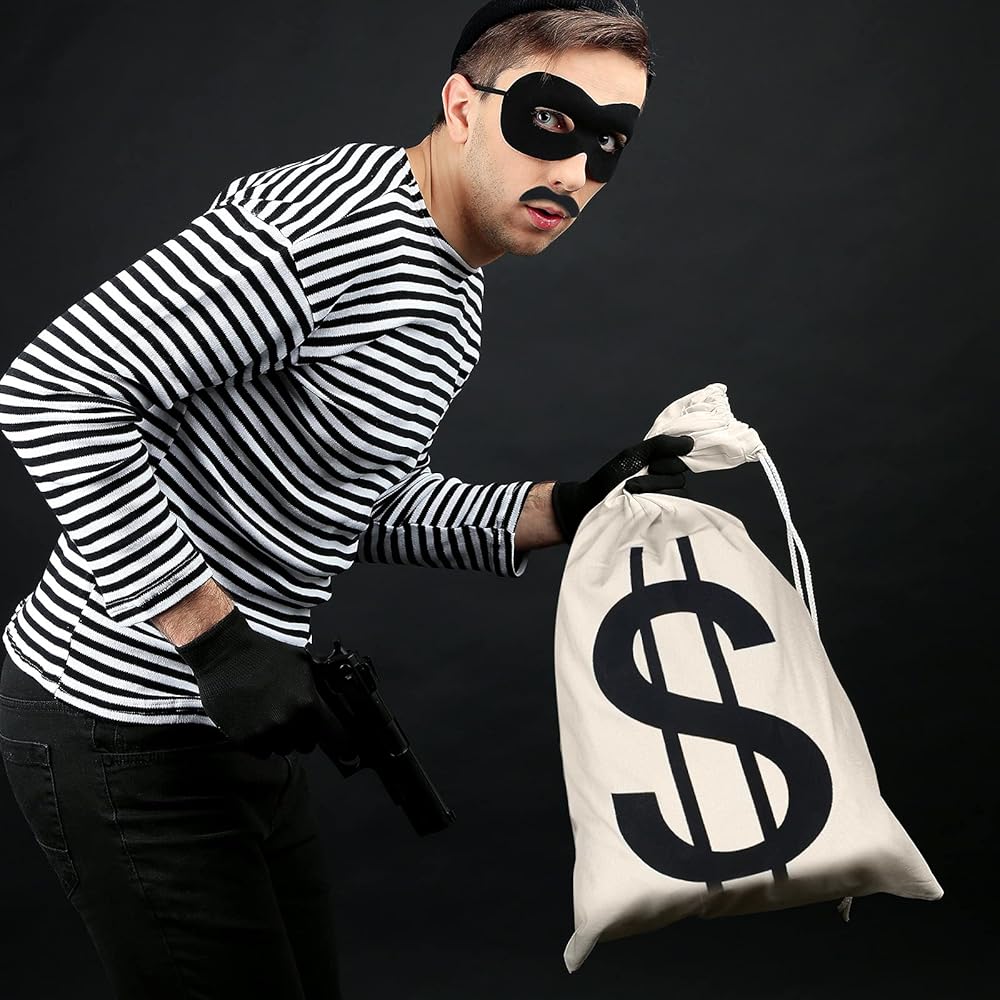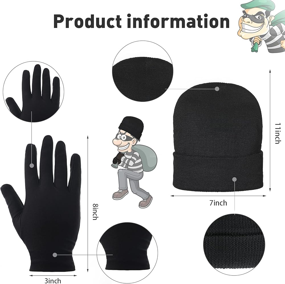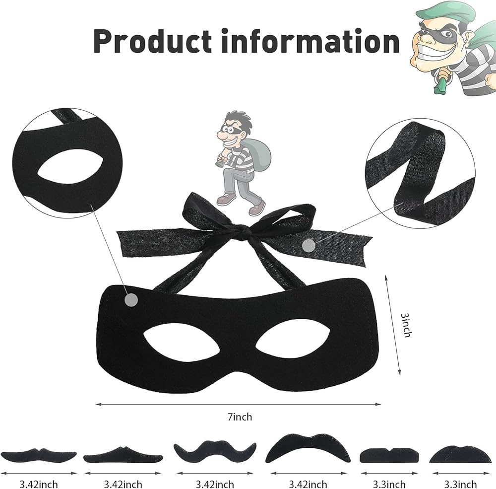 • Interesting cosplay prop set: the package contains 2 pieces canvas money drawstring pouch, 2 pieces black eye masks, 2 pieces knit beanie caps, 2 pairs gloves, 12 pieces adhesive fake mustaches, 22 pieces in total, a nice prop set for most people to dress up as thieves