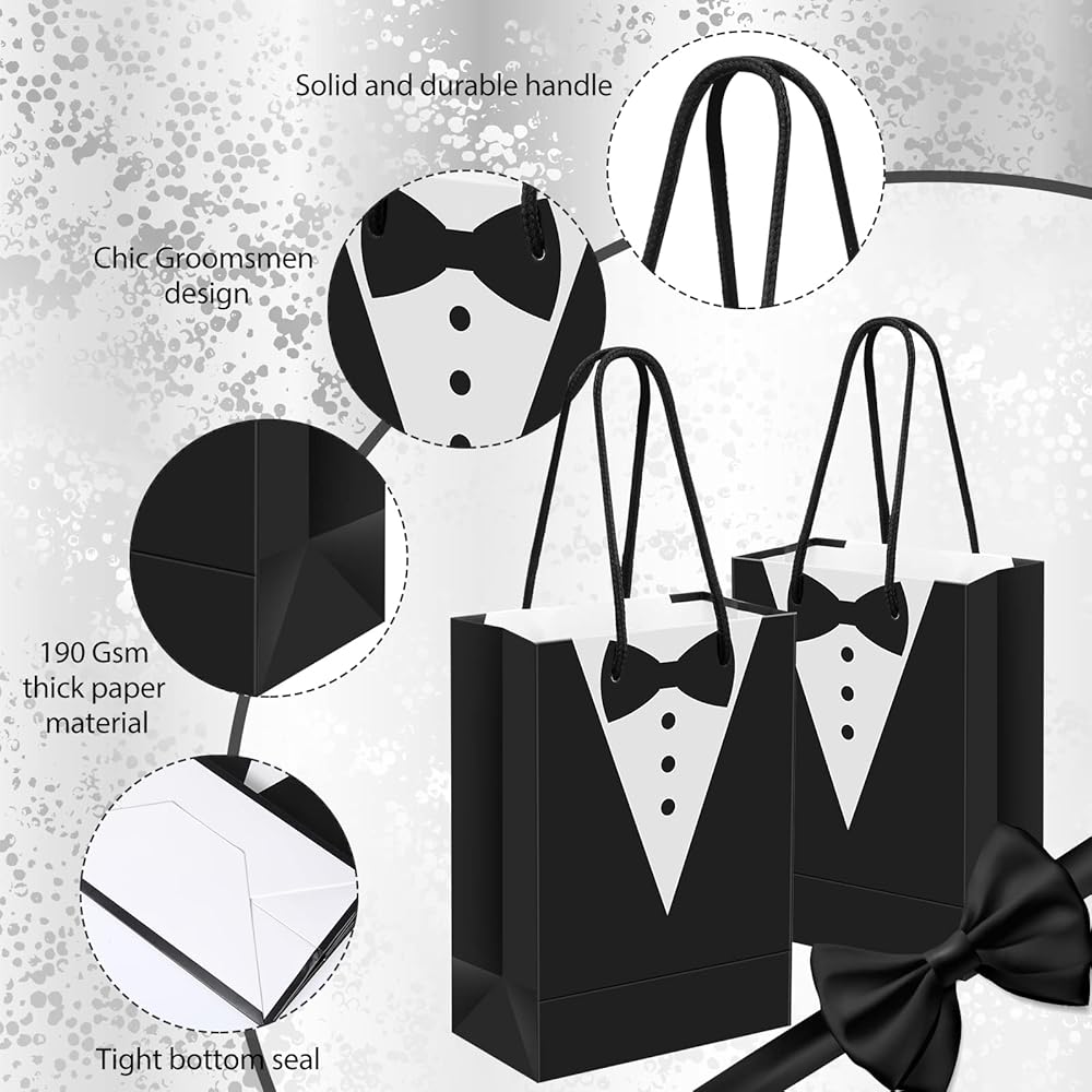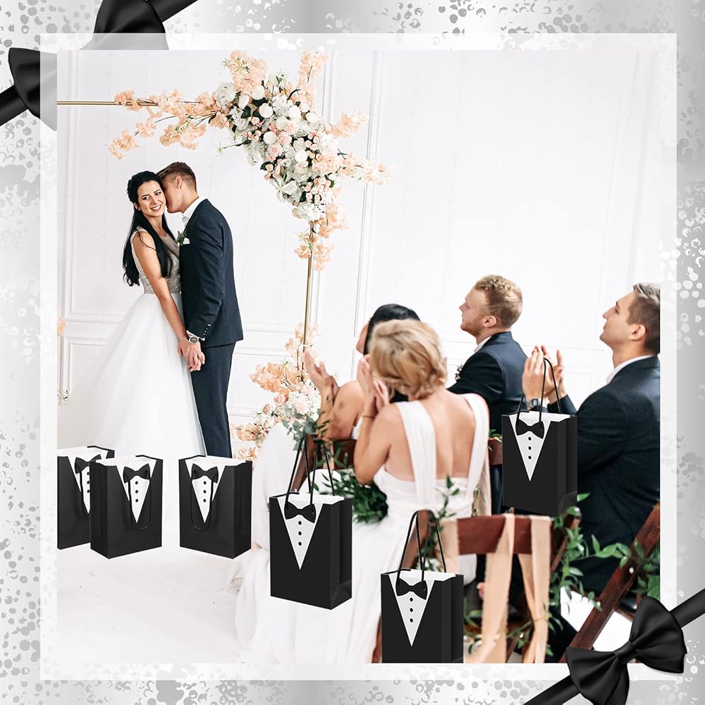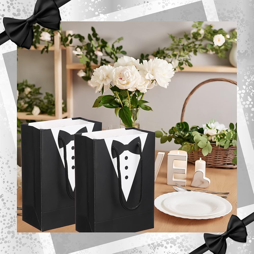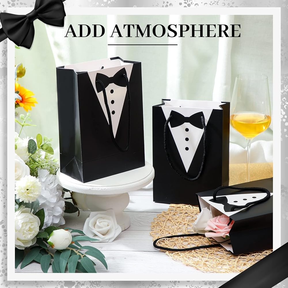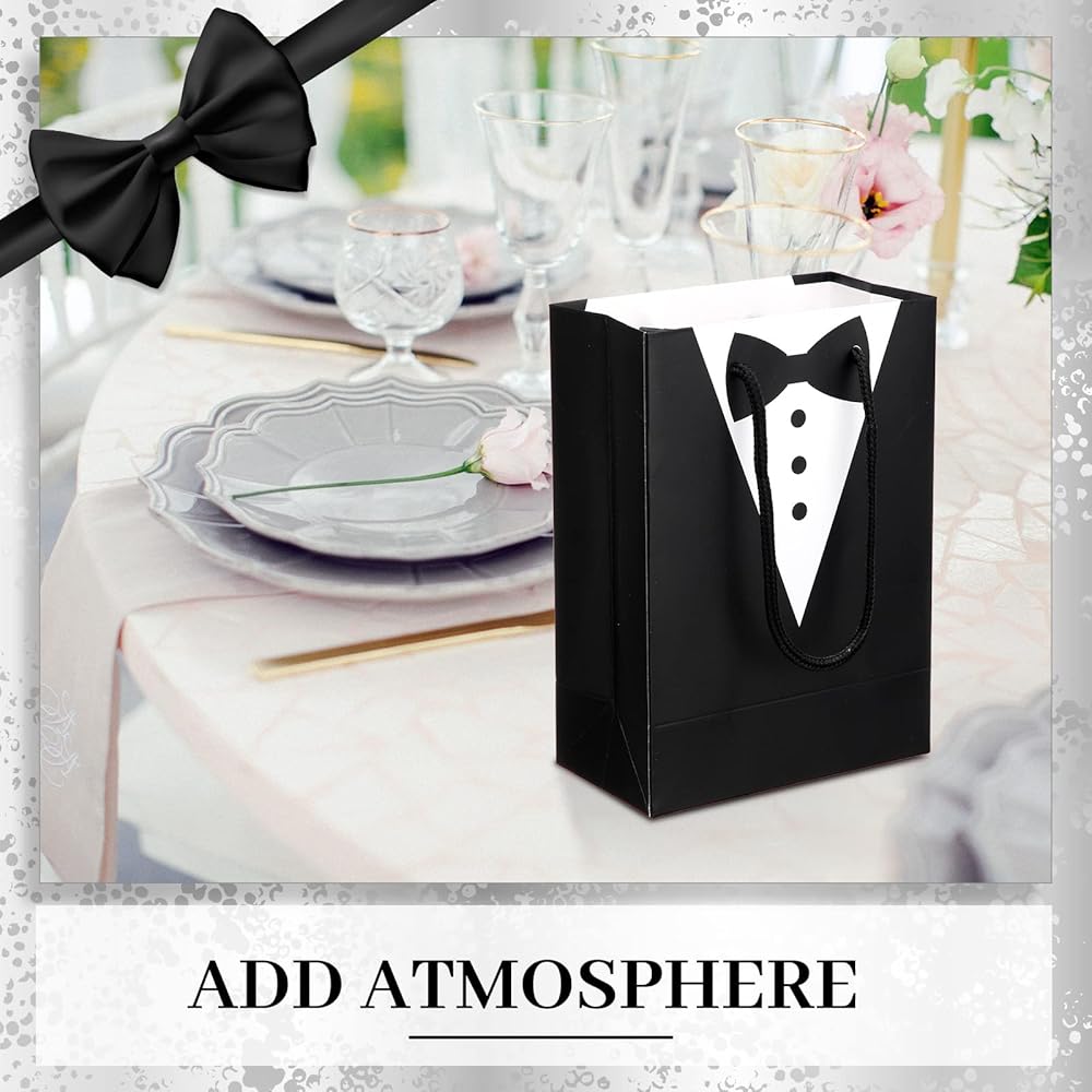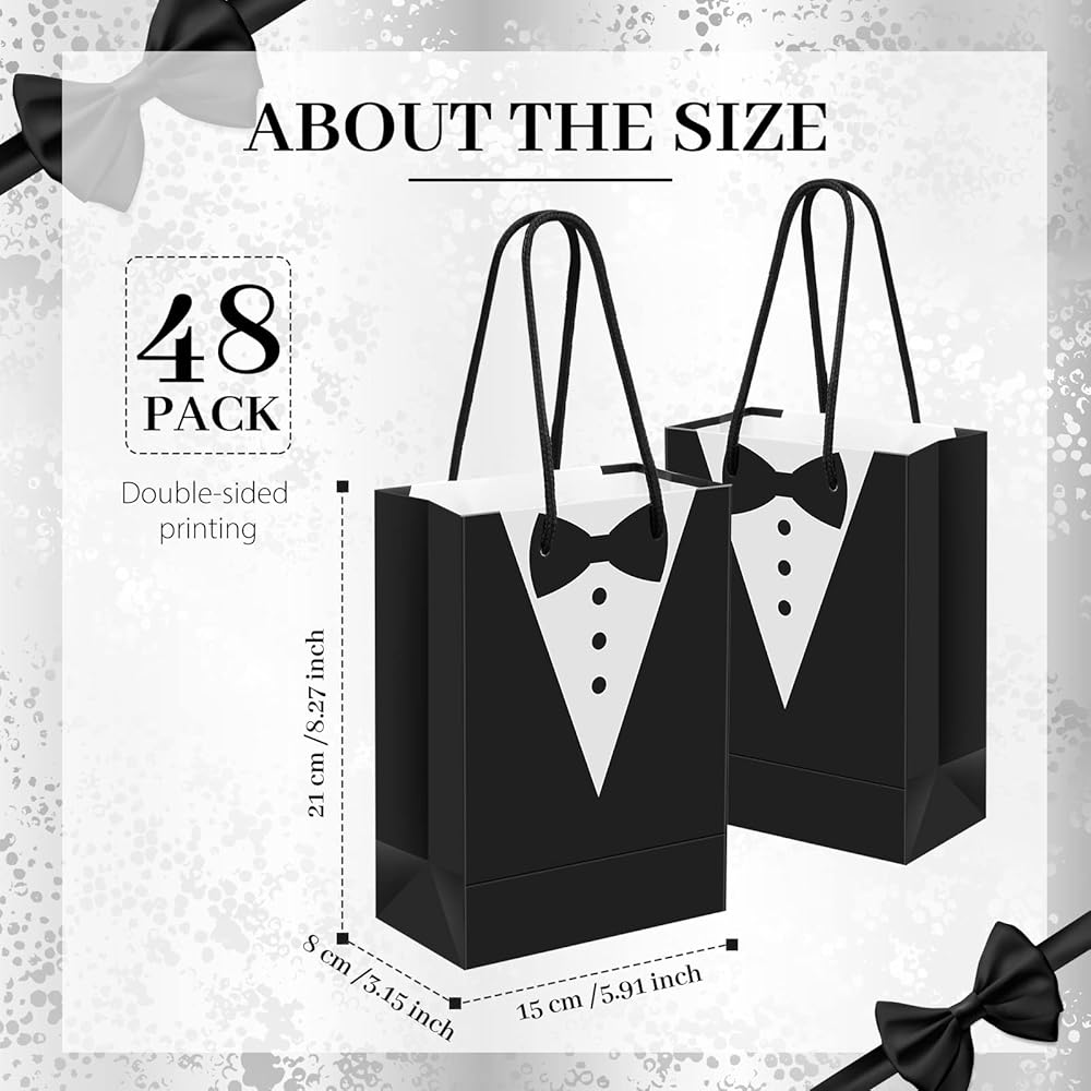 Package Content: you will receive 48 pieces of tuxedo paper gift bags, multiple quantities for your need and are nice additions to your gift packaging on wedding party