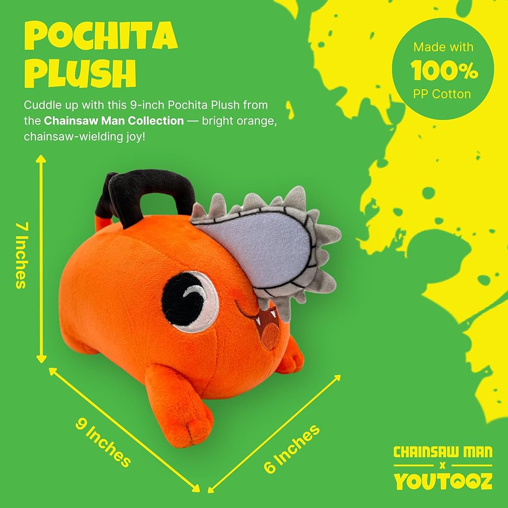• YouTooz Pochita Plush: يتخبط بشيتا بوتشيتا بوتشيتا البالش ، جسمه البرتقالي الفاتح ، على أي تحديات قد تواجهها ، في حين أن سلوكه المشمس سيبقيك مبتهجًا على مدار السنة! دائمًا ما يكون جاهزًا للعمل مع منشار رمادي كبير يمتد من منتصف وجهه النشوة ، يعلق مقابز على رأسه ومؤخره على جانبي ذيله المحبب.