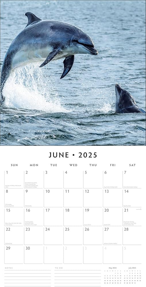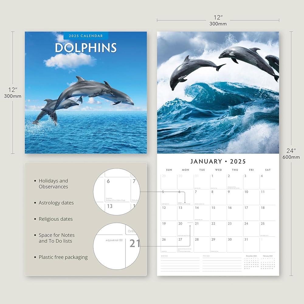 In addition to showcasing these incredible creatures, this calendar includes practical features like holidays and observances, astrology dates, religious events, and space for notes and to-do lists. The 2025 'Dolphins' calendar is perfect for staying organized while celebrating the beauty and intelligence of one of the ocean's most beloved animals.