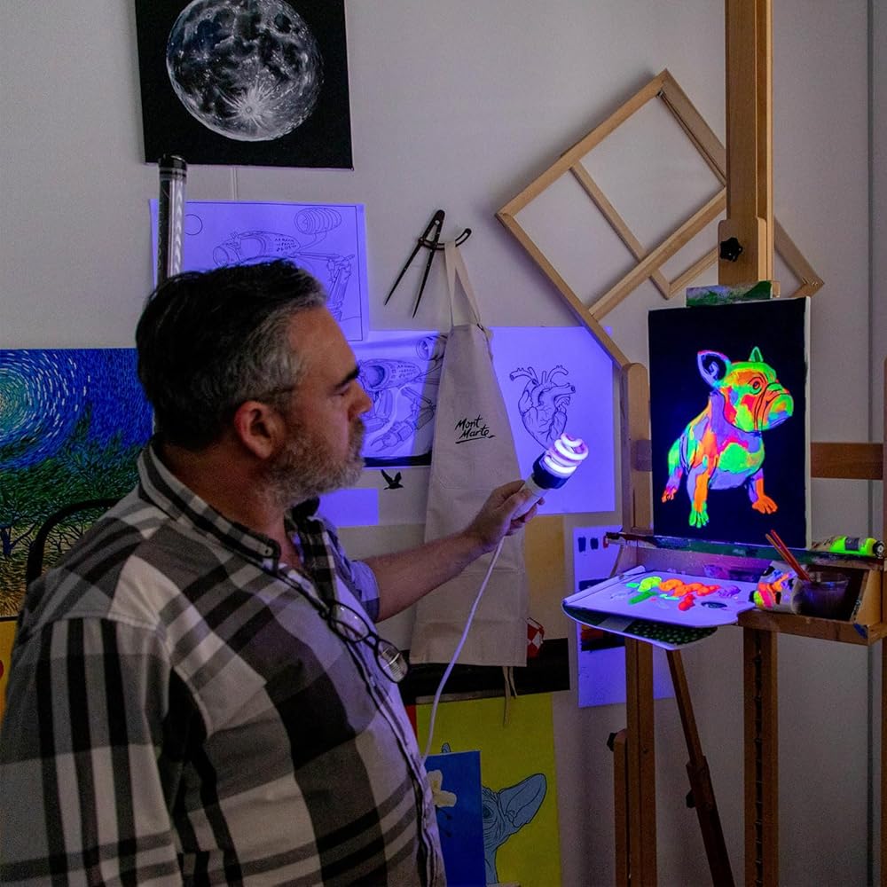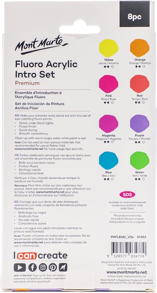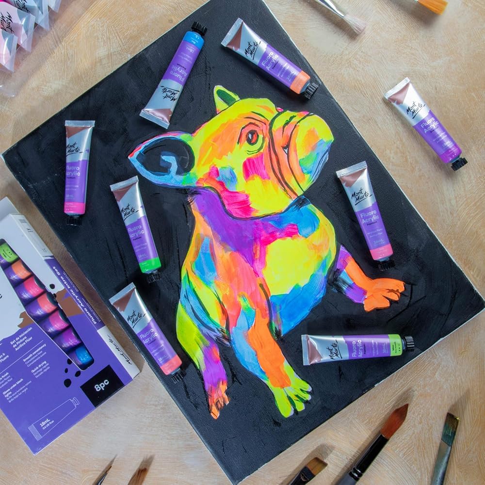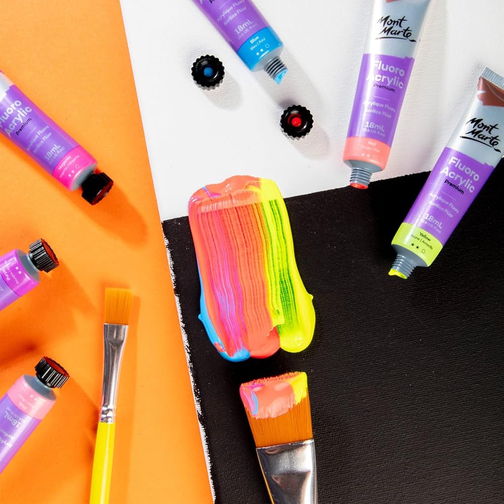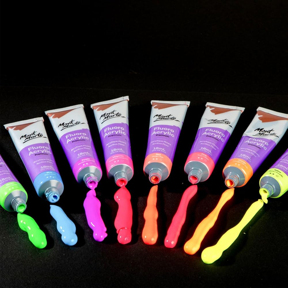 Mont Marte fluorescent paint is perfect for adding luminescent colours to your art and craft projects. This set features 8 bright colours in 18ml tubes that glow under black lights and have a smooth lustre on a range of surfaces such as canvas, card and wood. The smooth consistency and opaque finish of each fluorescent 18ml paint tube in this set offers a brilliant neon look. Create bright artworks and craft projects at home or school with the Mont Marte Fluro Acrylic Paint Intro Set.