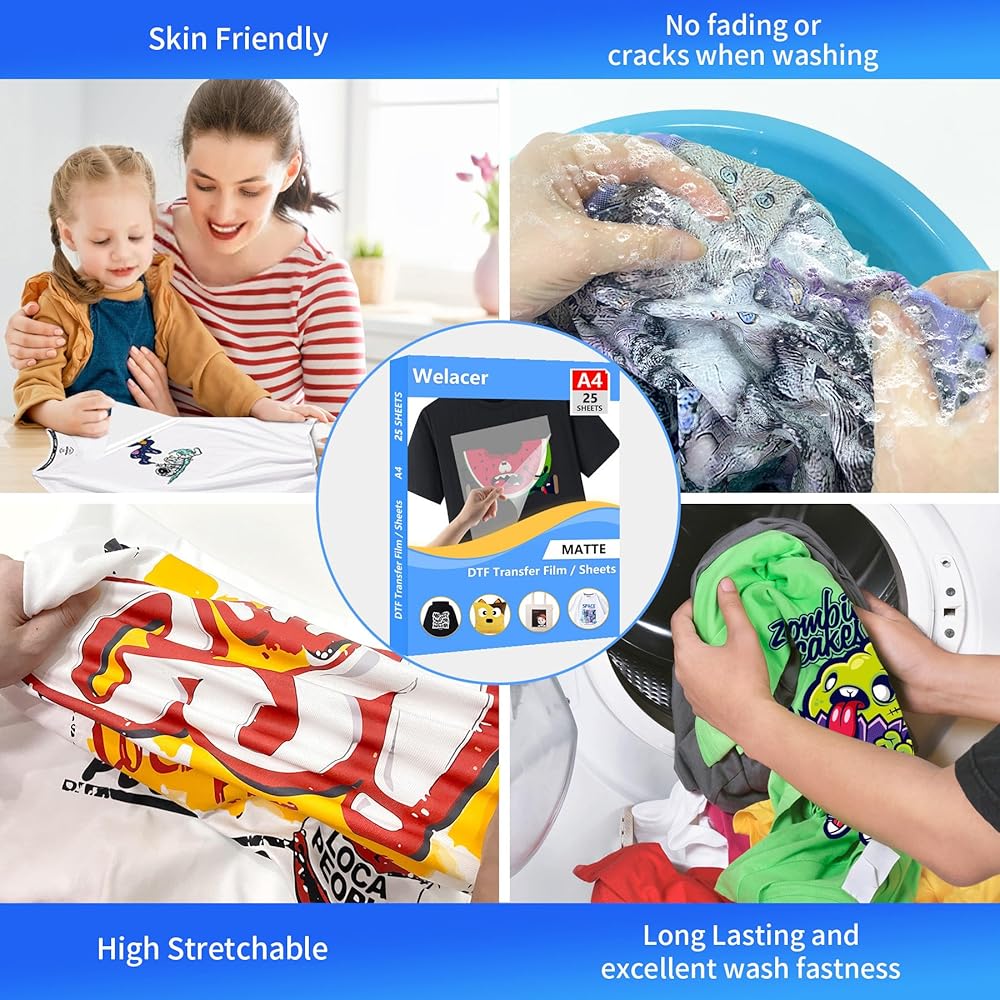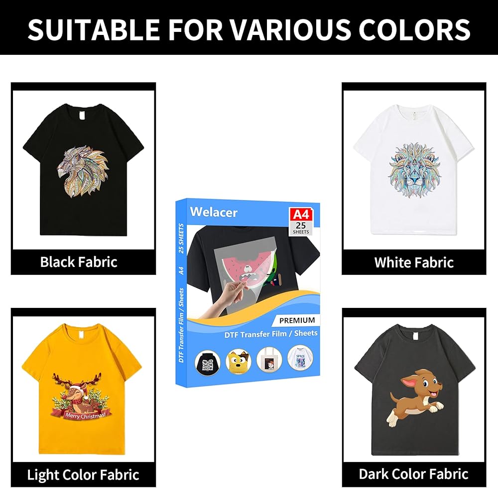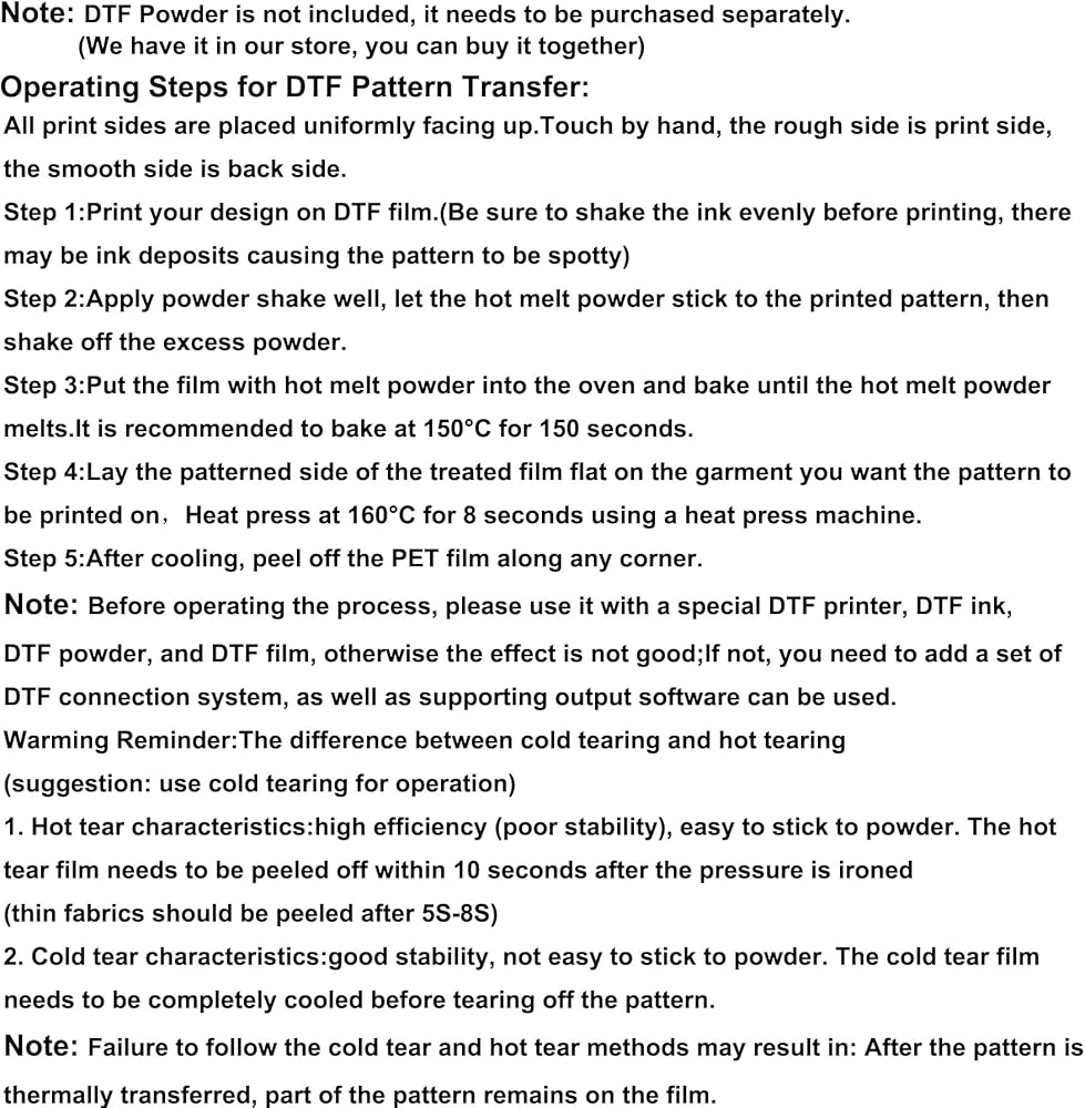 لون متوافق وحيوي. تعمل أوراق فيلم DTF DTG Transfer مع طابعات Epson Inkjet Printers DTG DTF L1800 F2100 ET4700 XP15000 ، والعمل مع حبر نقل DTF ومسحوق DTF. حية ، لون بوضوح.