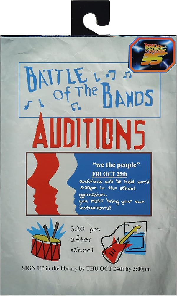 NECA is thrilled to present the Ultimate Audition Marty McFly from Back To The Future featuring the officially licensed likeness of Michael J. Fox. Audition Marty comes with an all-new jacket sculpt without the vest. He is also equipped with brand new accessories, including an audition guitar, a fading hand, a cassette player, and a McFly family photo. Window box packaging.