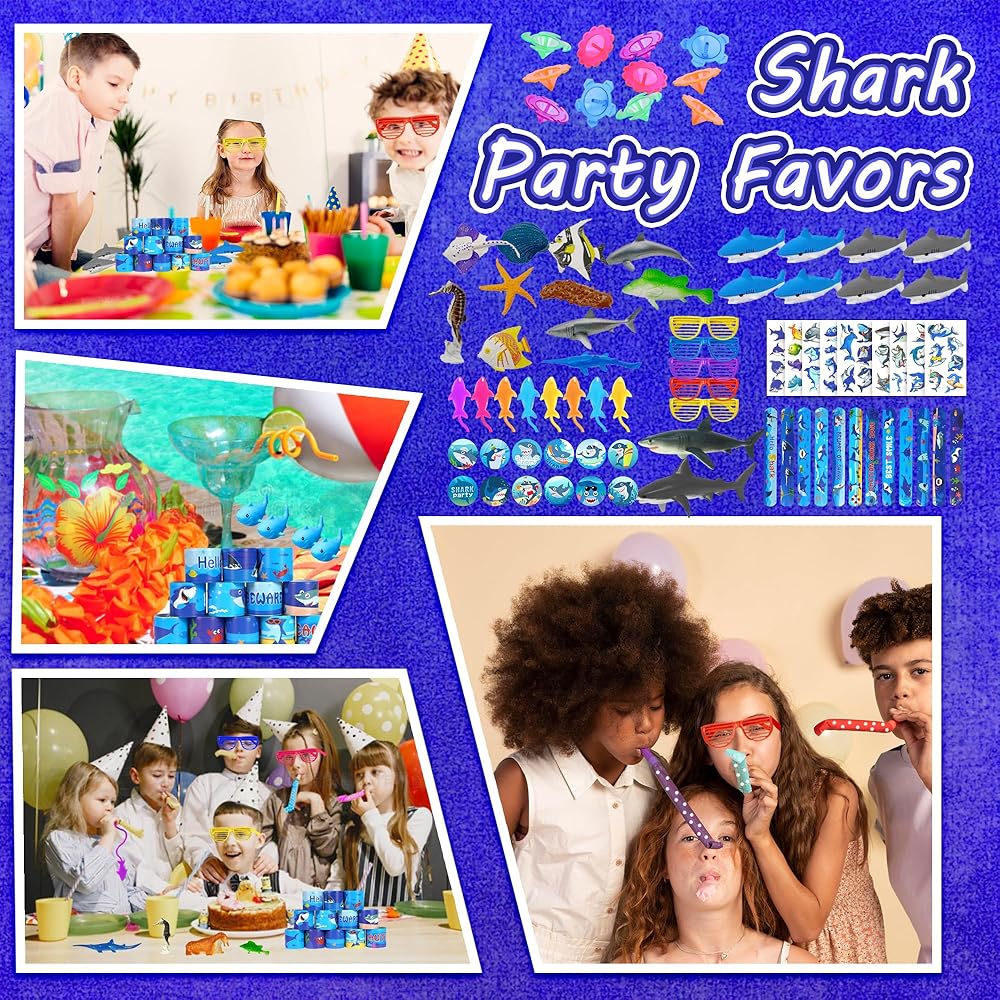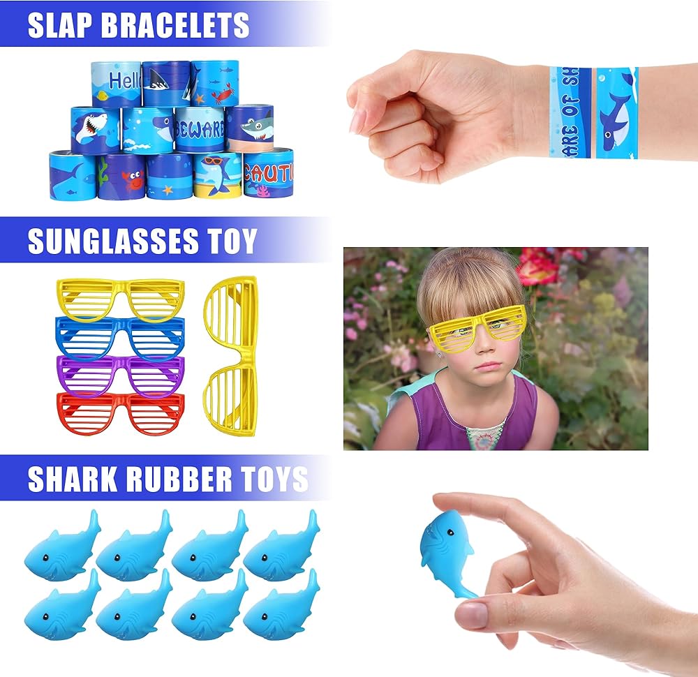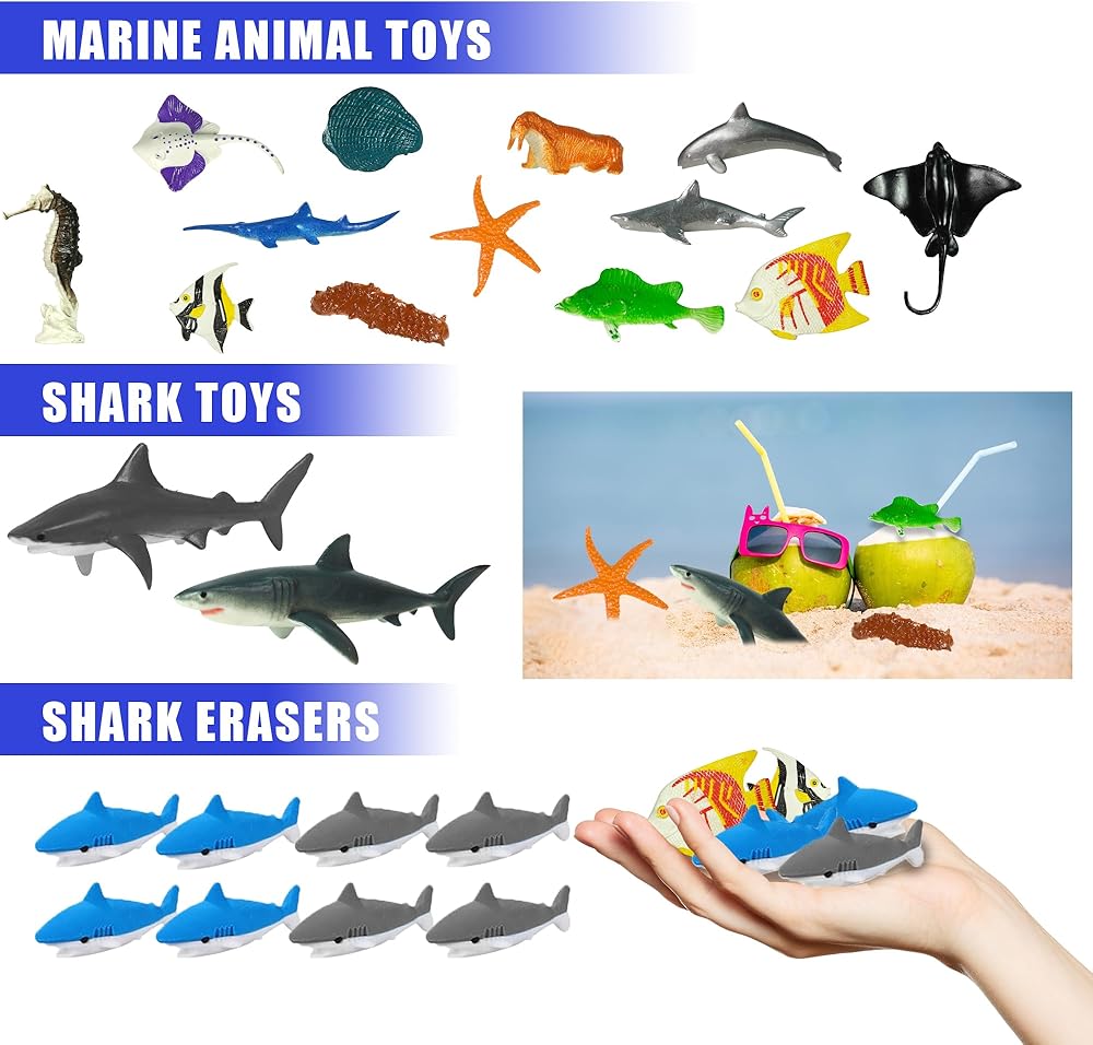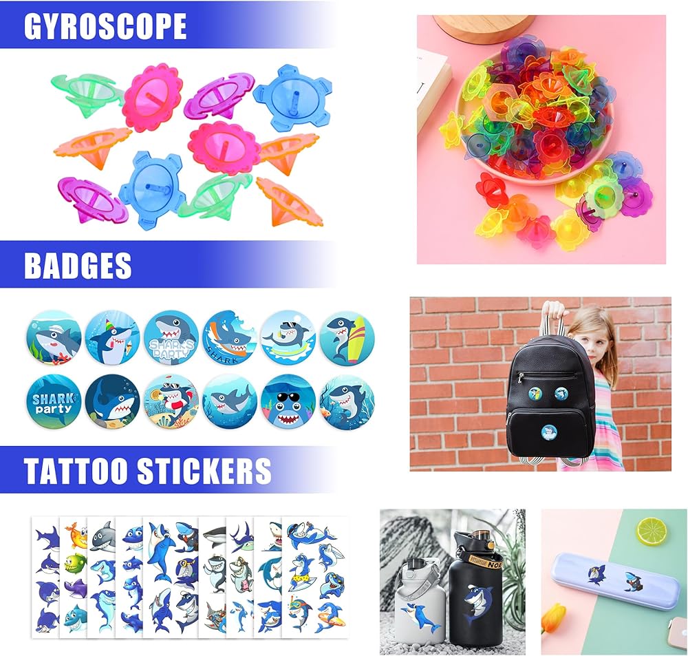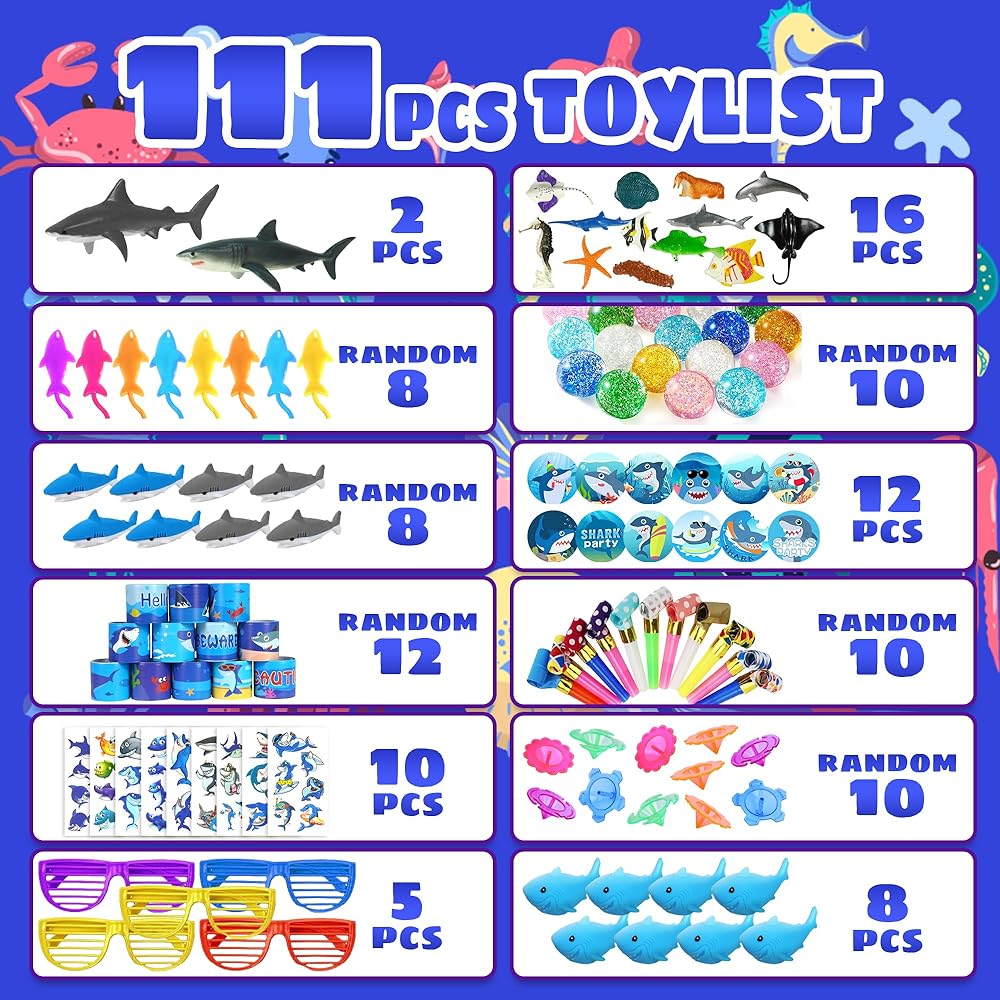 الكمية: سوف تتلقى 16 لعبة حيوانات حيوانات البحر ، 2 ألعاب القرش ، 10 منبذات الحفلات ، 8 ألعاب لزجة ، 12 شارات ، 8 محايات ، 10 جيروسكوب ، 12 أساور صفعة ، 5 أكواب ، 10 كرات مرنة ، 8 ألعاب القرش المطاطية ، 10 ملصقات الوشم.