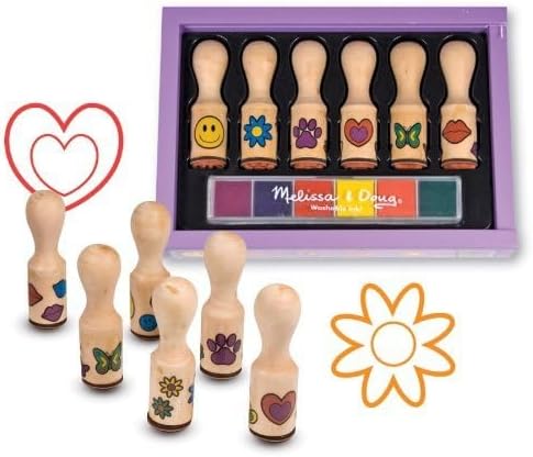 With cheerful artwork and easy-to-grasp handles, this set of 6 rubber stamps is perfect for preschoolers. The extra-long wooden handle keeps fingers off the stamp pad as kids stamp happy faces, mouthes, stars, butterflies and more. Housed in a sturdy wooden storage tray, the set also includes a six-color stamp pad. Ink is machine washable. With 6 unique designs, this set is the perfect gift set on its own.