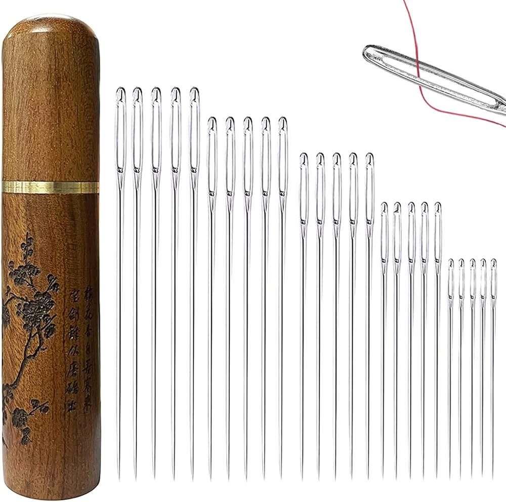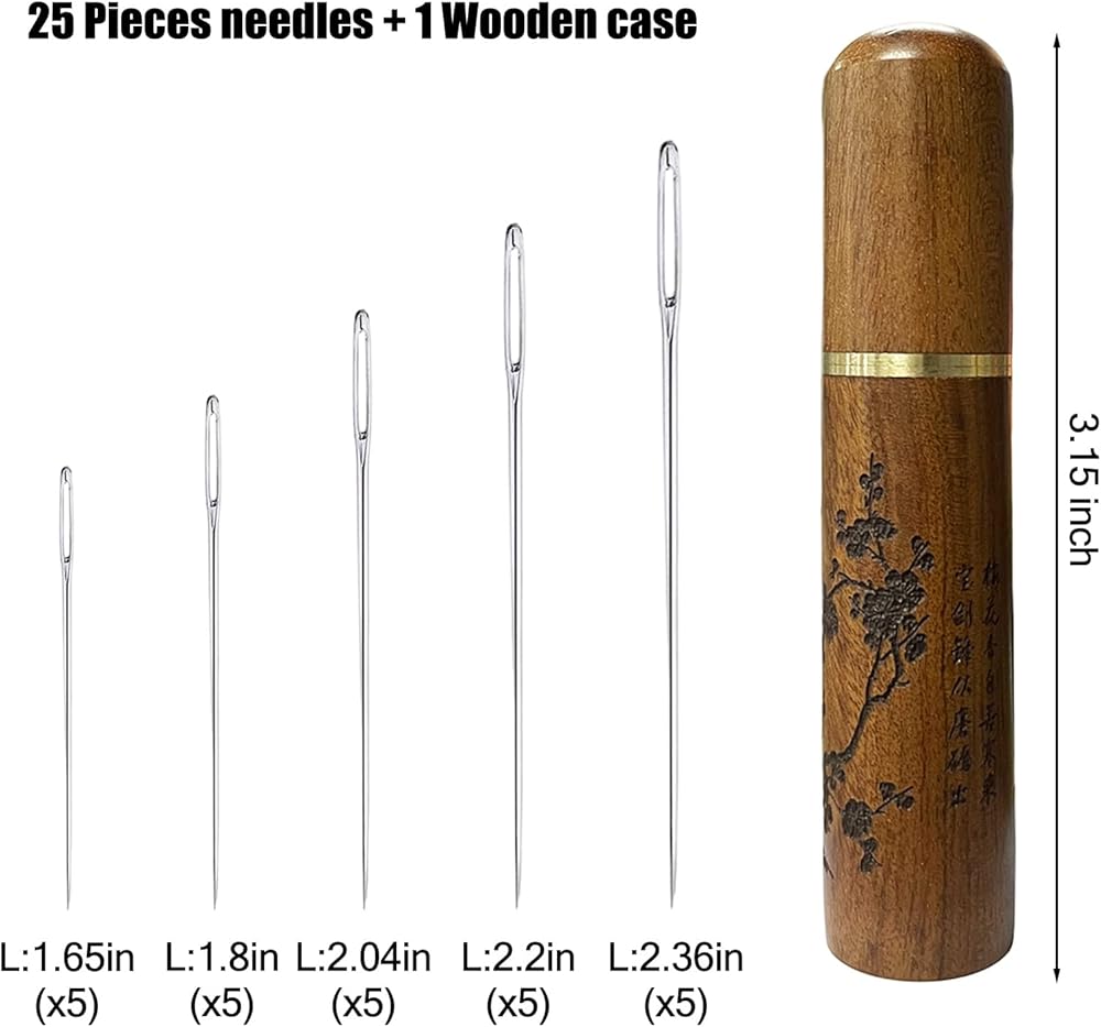 إبر التطريز لإبرة الخياطة اليدوية - 25 قطعة إبر خياطة كبيرة للعين، إبرة عين كبيرة للغرز، الرتق، اللحف، إبرة الغزل لوازم حادة مع نمط نحت حالة إبرة خشبية - YAWALL