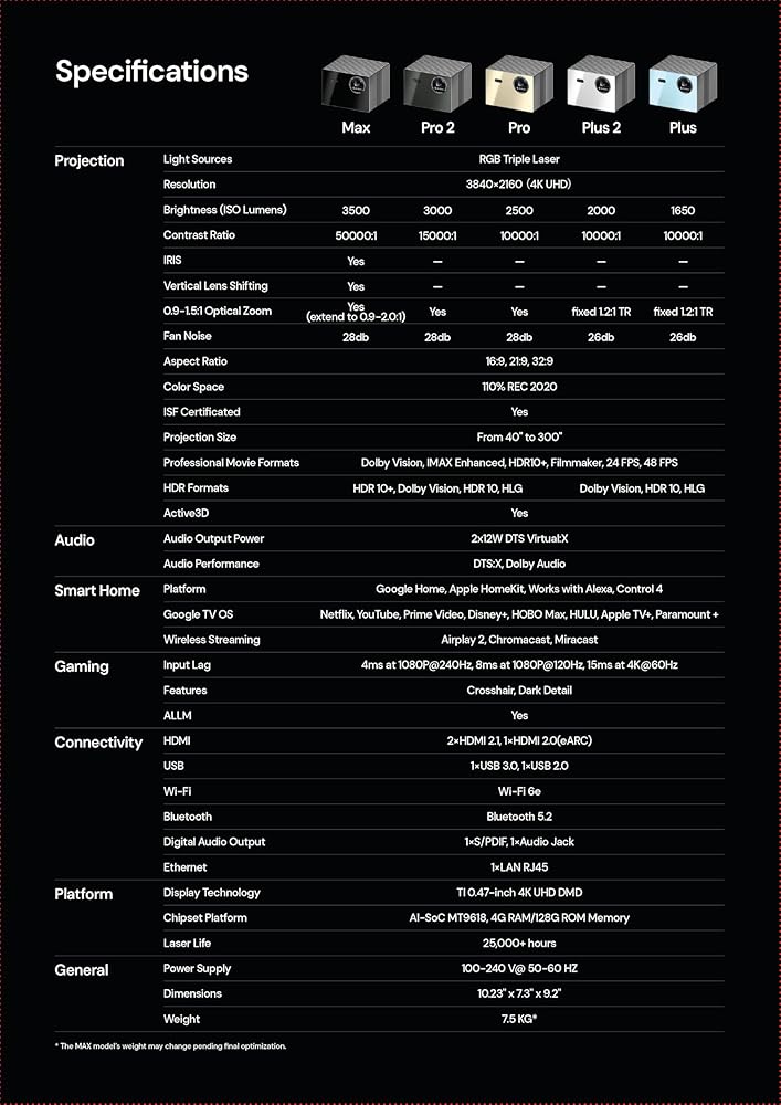 جهاز عرض Laser Treammaster Plus2 Triple Triple ، أداء أسرع 2x ، ألعاب 4 مللي ثانية ، IMAX ، Google TV ، HDR10+، AI 4K UHD ، مع Smart Google Home و Apple HomeKit ، Dolby Vision & Atmos