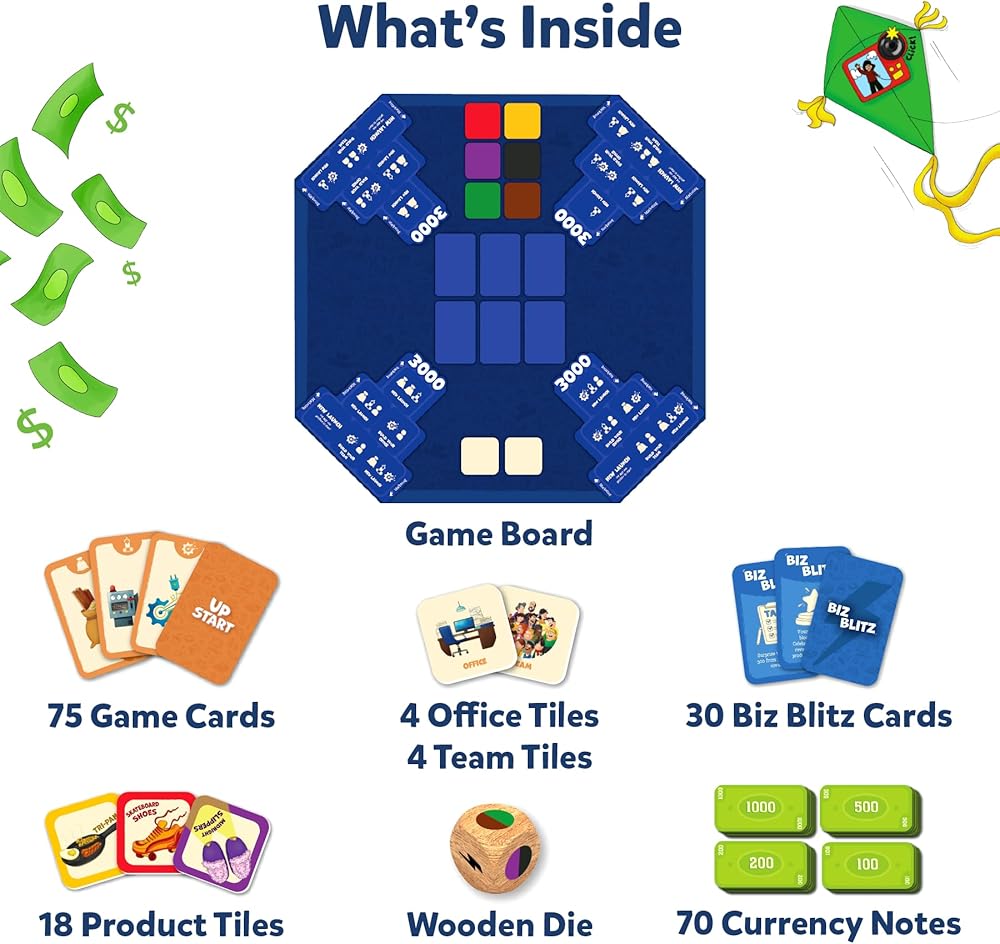 • يشمل: لوحة واحدة ، 70 ملاحظة للعملة ، 75 بطاقة ألعاب ، 30 بطاقة Biz Blitz ، 26 منتجًا ، Team و Office Tiles ، 1 Die Wooden ودليل تعليمات.