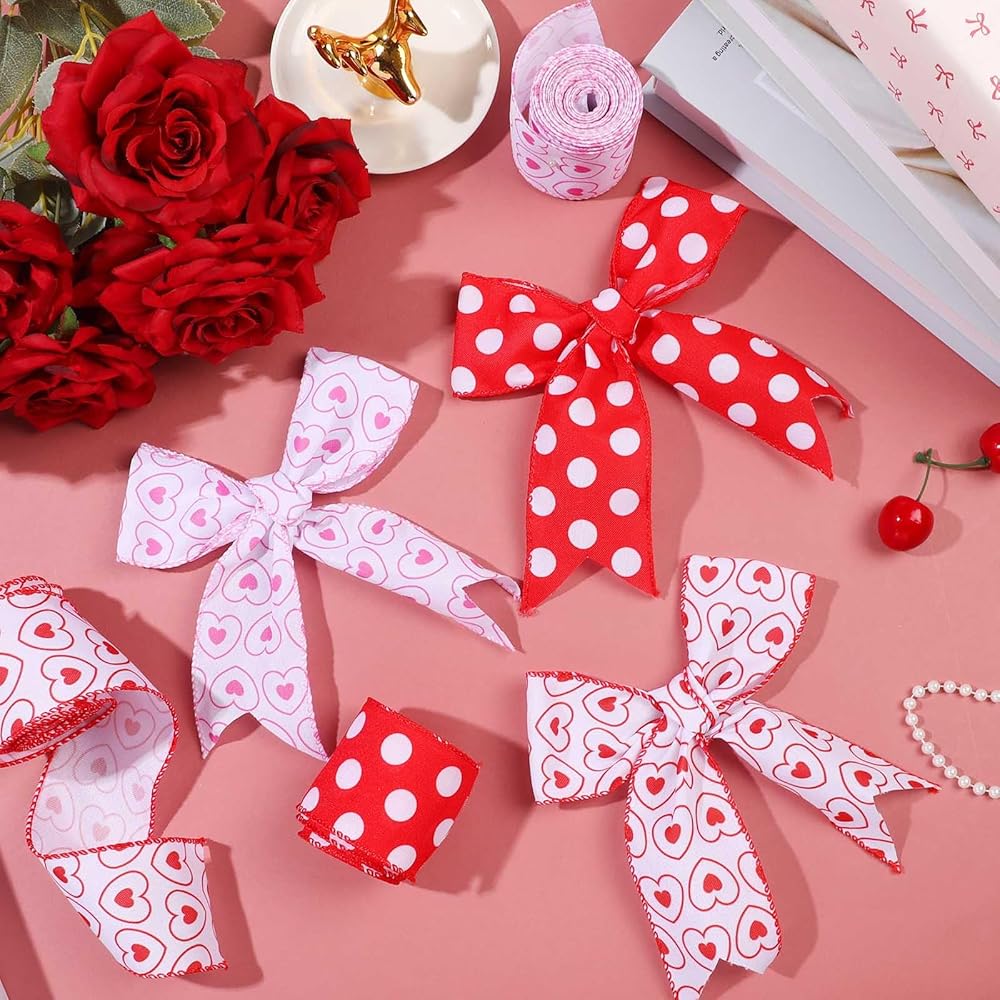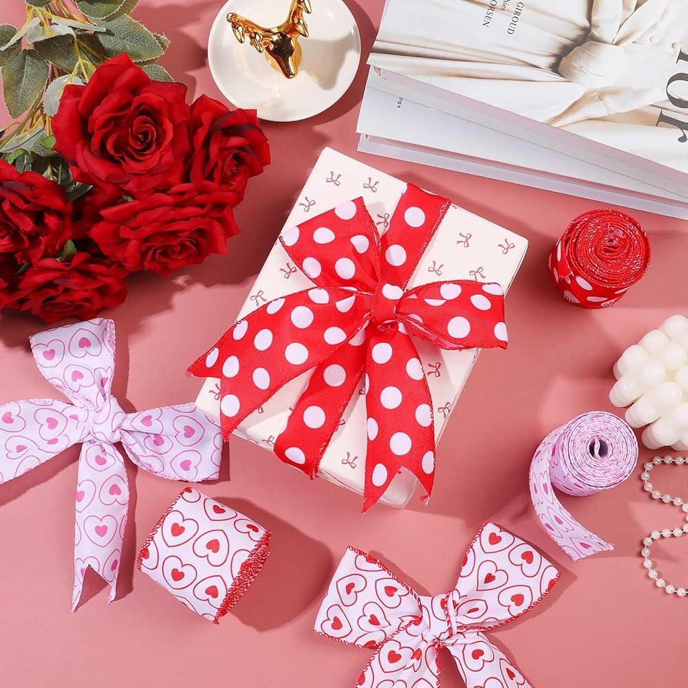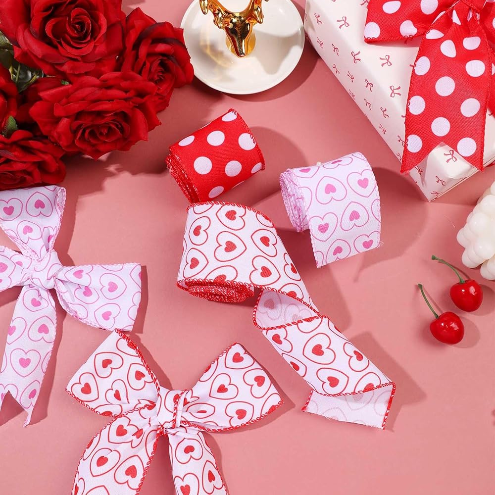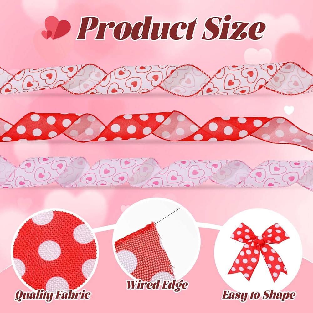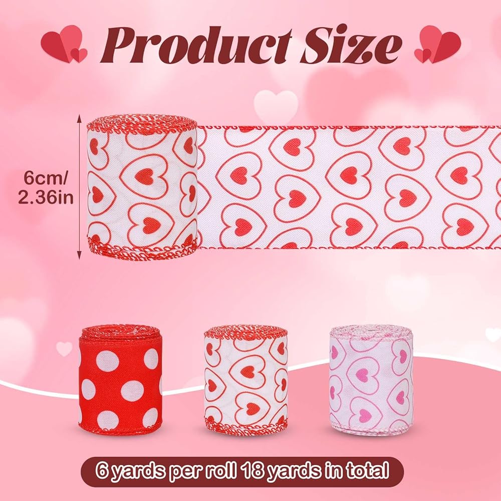 3 لفات 18 ياردة عيد الأم شريط حافة سلكية ، 2.5 بوصة من القلب الوردي الأحمر الشريط الشريط السلك
