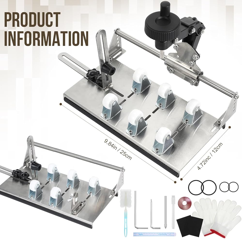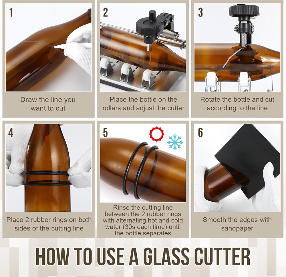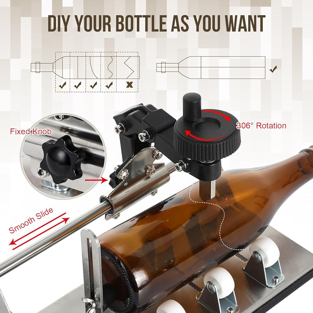 Design and Features: this bottle cutter includes 6 support wheels designed to stabilize the bottle better, equipped with a new knob that can be locked in place for better cutting and also released for horizontal movement; 2 strong diamond carbide blades ensure over 400, 000 cuts, made with a stable and robust stainless steel base plate, meeting the quality standards you expect