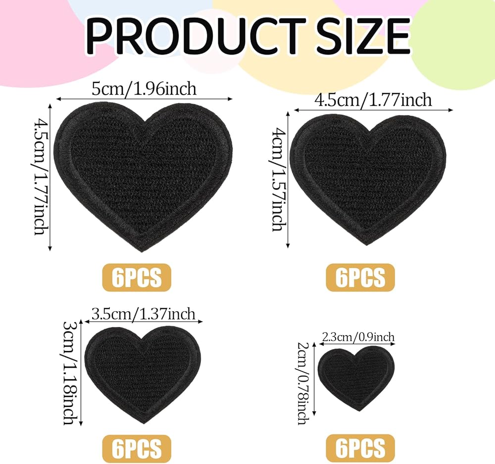 【Package Contents】You will get 24 pieces of beautifully designed heart ironing patches. 4 different sizes, 6pcs per size. L:5.1 × 4.4cm / 2 × 1.7in. M:4.4 × 3.8cm / 1.7 × 1.5in. S:3.1 × 2.7cm / 1.2 × 1.1in. XS:2.2 × 1.9cm / 0.9 × 0.7in. Sufficient quantity, and different sizes can meet your various daily needs, and enrich your inventory.