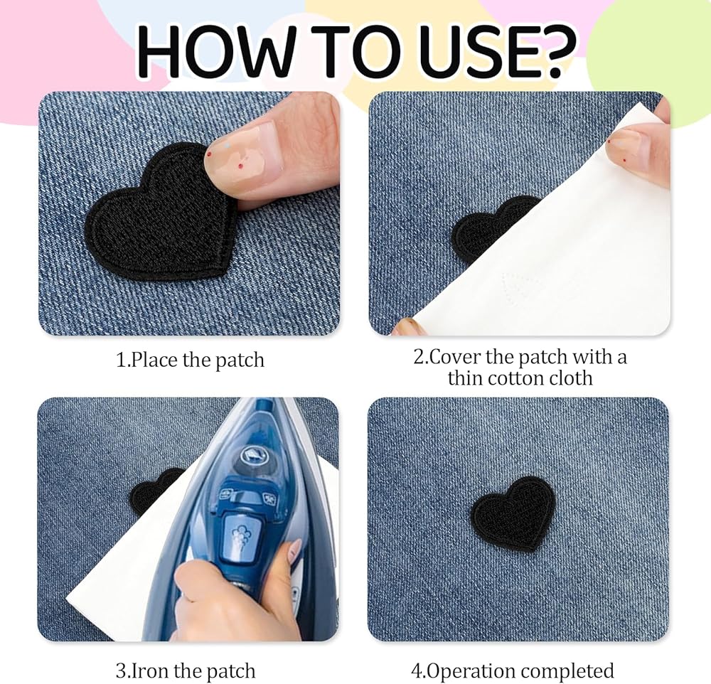 【Easy to use】The tiny heart-shaped patch is easy to use. First of all, place the heart-shaped patch on the desired position, then cover the patch with a cloth. Set the iron to "COTTON" and iron at 150℃ for about 15-30 seconds. Finally, turn the garment over to iron again and allow to cool for 1 hour before using. As it is a small iron-on patch, it is recommended to sew the fabric patch to make it more secure after ironing to ensure that the patch will not come off and will last longer.