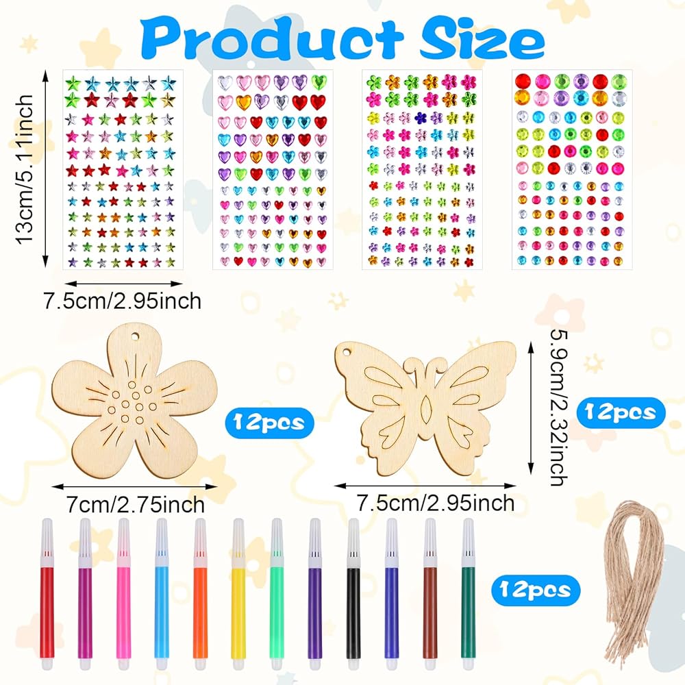 • 【Craft Kits 】You will get 12 pieces of unpainted wooden butterflies and 12 pieces of wooden flowers, 12 pieces of watercolor pens, 4 sheets of self-adhesive gemstone stickers in different styles, and 1 string of decorative rope. Two different shapes of wooden butterflies and flowers can meet creative needs, and the complete materials allow you to make beautiful butterfly craft kits.