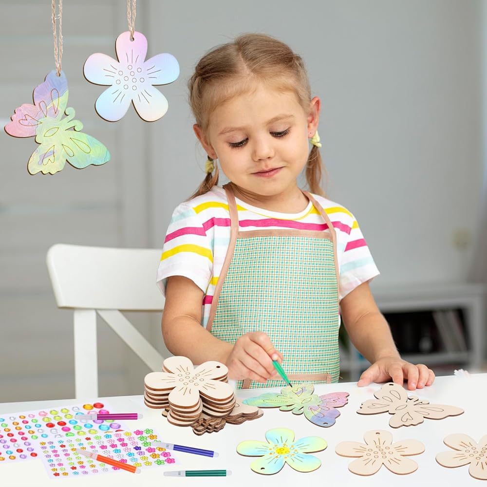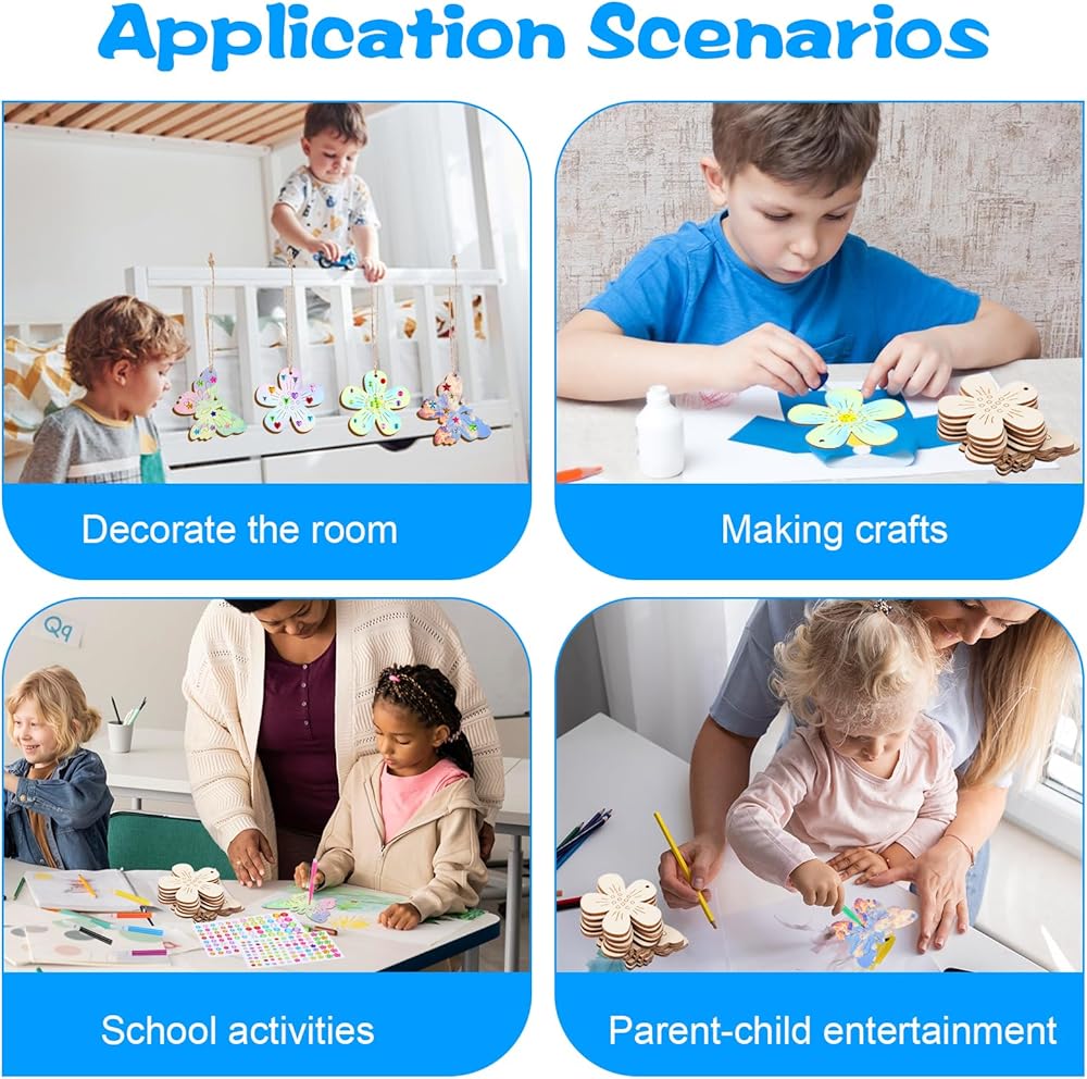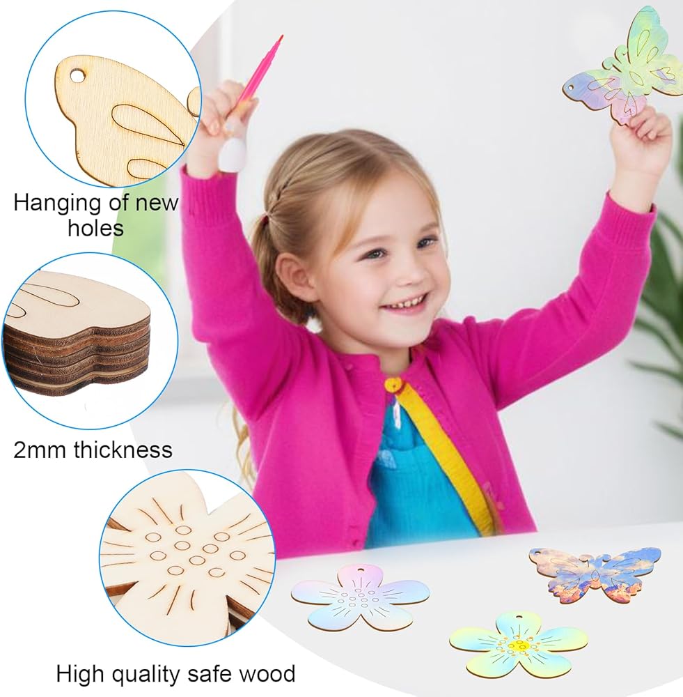 • 【Creative Crafts】Painting crafts can effectively train hand-eye coordination, attention, and thinking ability. Wooden butterflies and flowers can be painted, dyed, carved, glued, and written on both sides. We can stimulate their creativity and decorate their rooms. The wooden butterflies have small holes and can be strung with ropes for use as hanging decorations.