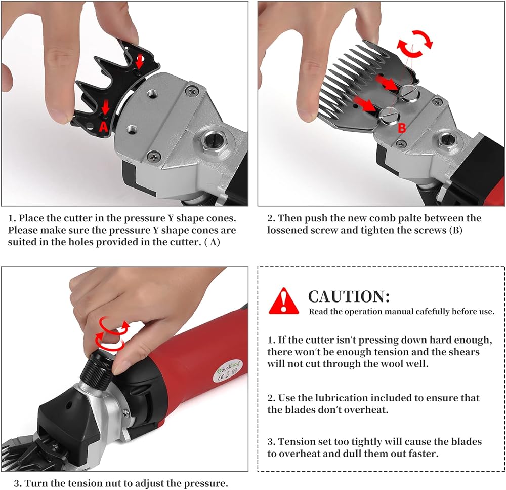 • [تجنب الخمول والتشغيل لفترة طويلة]: عند استخدام المقص الكهربائي ، تذكر تشحيم الشفرة لتجنب التشغيل لفترة طويلة. ستساعد طقم مقصات الأغنام عالية الجودة في استخدام رشاشات التبريد كل بضع دقائق وأخذ فترات راحة صغيرة وإلا فإن المقصات ستحمل درجة حرارة. يرجى قراءة التعليمات بعناية قبل الاستخدام.