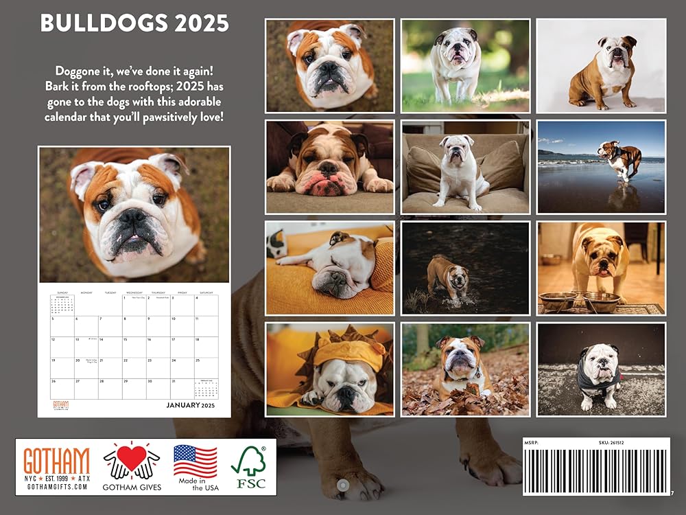 Bulldog Calendar 2025 Monthly Wall Calender 12 Month | American Made In The USA