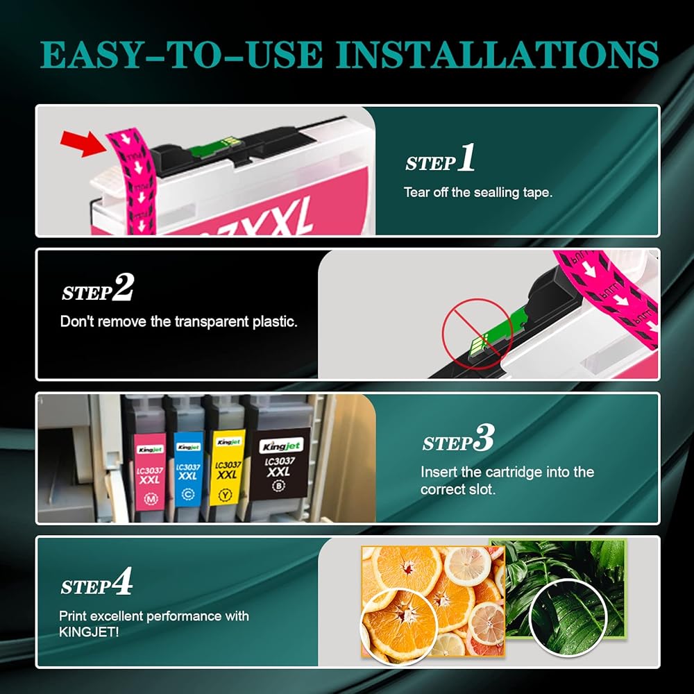 • حزمة محتويات: 1 x LC3037 LC3039 Black ، 1 X LC3037 LC3039 Cyan ، 1 x LC3037 LC3039 MAGENTA ، 1 X LC3037 LC3039 Yellow (4 خراطيش عالية العائد في المجموع) ، قطعة واحدة من التعليمات. استبدال خرطوشة حبر عالية العائد متوافق مع الأخ LC3037 LC3039