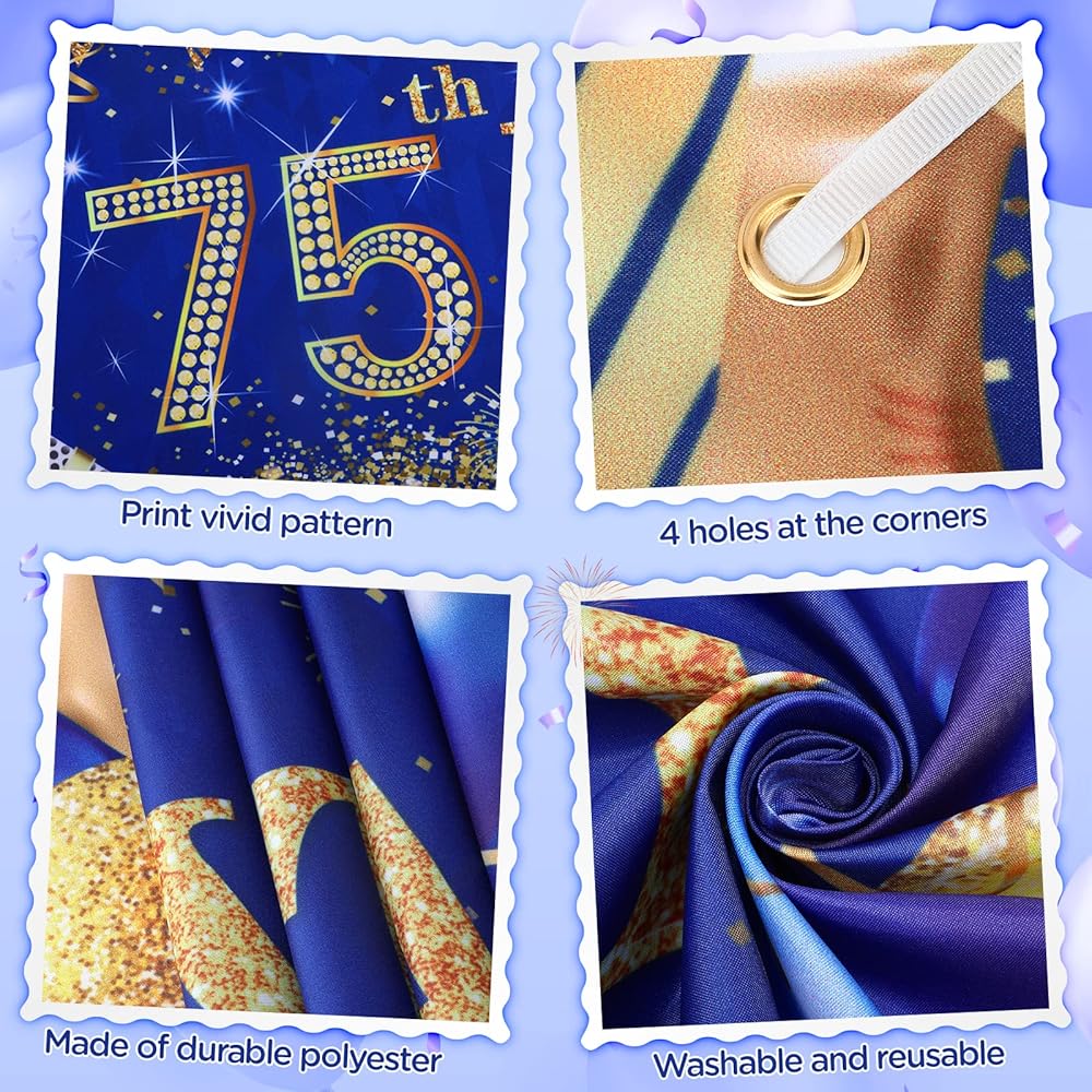 ✨75 مواد لافتة عيد الميلاد: لافتة ساحة عيد ميلاد الأزرق والذهبي السعيد للرجال والنساء مصنوعة من بوليستر متينة وخفيفة الوزن وقابلة للطي وقابلة للغسل. يمكن إعادة استخدامها لفترة طويلة. مطبوعة مع "عيد ميلاد سعيد 75" ، جنبًا إلى جنب مع البالونات 18pcs كزخارف للحفلات ، فإنه يضيف جوًا رائعًا لحفلة عيد ميلاد.