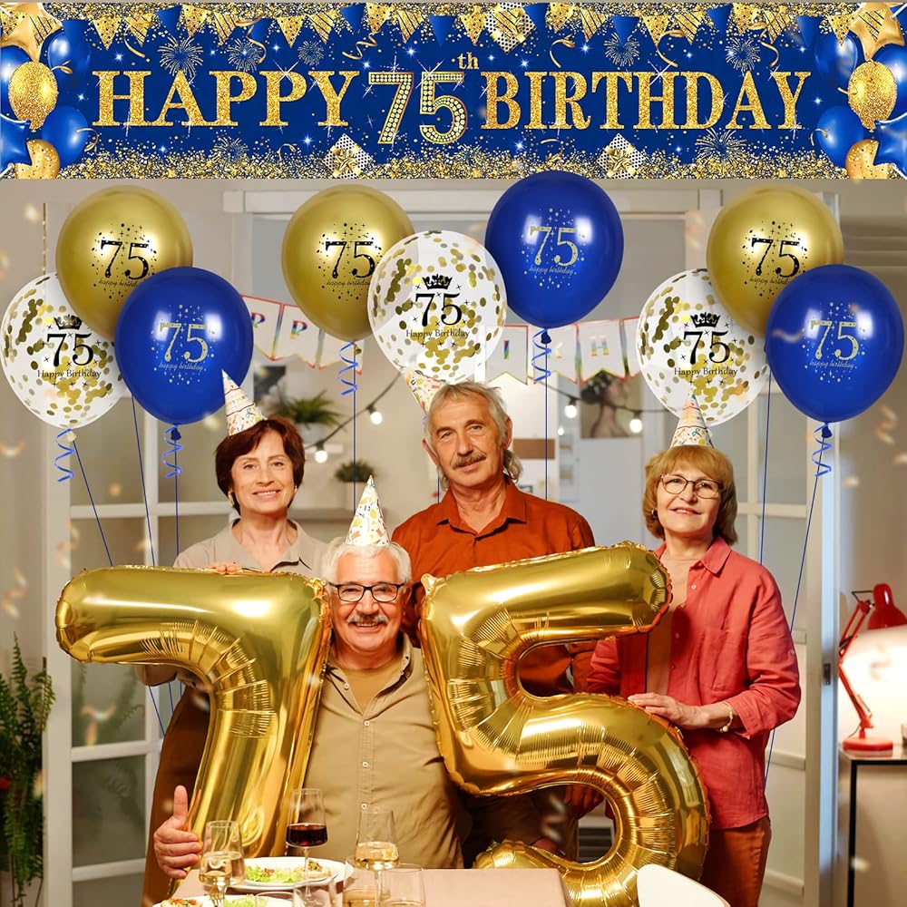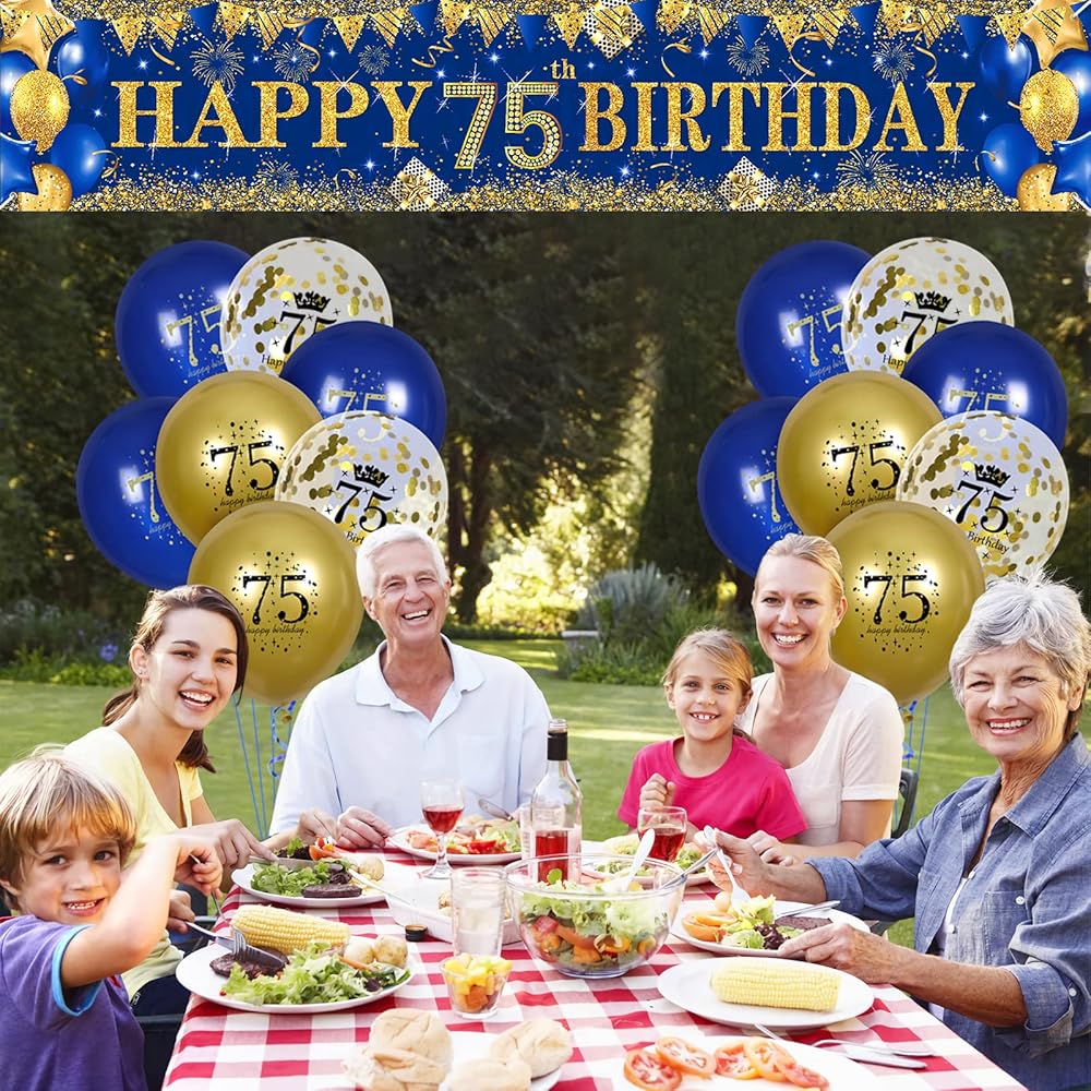مجموعة أعياد الميلاد ✨75: ستحصل على لافتة عيد ميلاد باللون الأزرق والذهبي ، 18 قطعة من البالونات عيد ميلاد سعيد اللاتكس مع نمط '' 75 Happy Happy '' (6pcs بالونات الذهبية + 6pcs البالون الأزرق البحري + 6pcs الشفافة القابلة للتنفاث الواضحة). سيكون ديكورًا مثيرًا للإعجاب لحفلة عيد ميلاد أعياد الميلاد البالغة من العمر 75 عامًا.