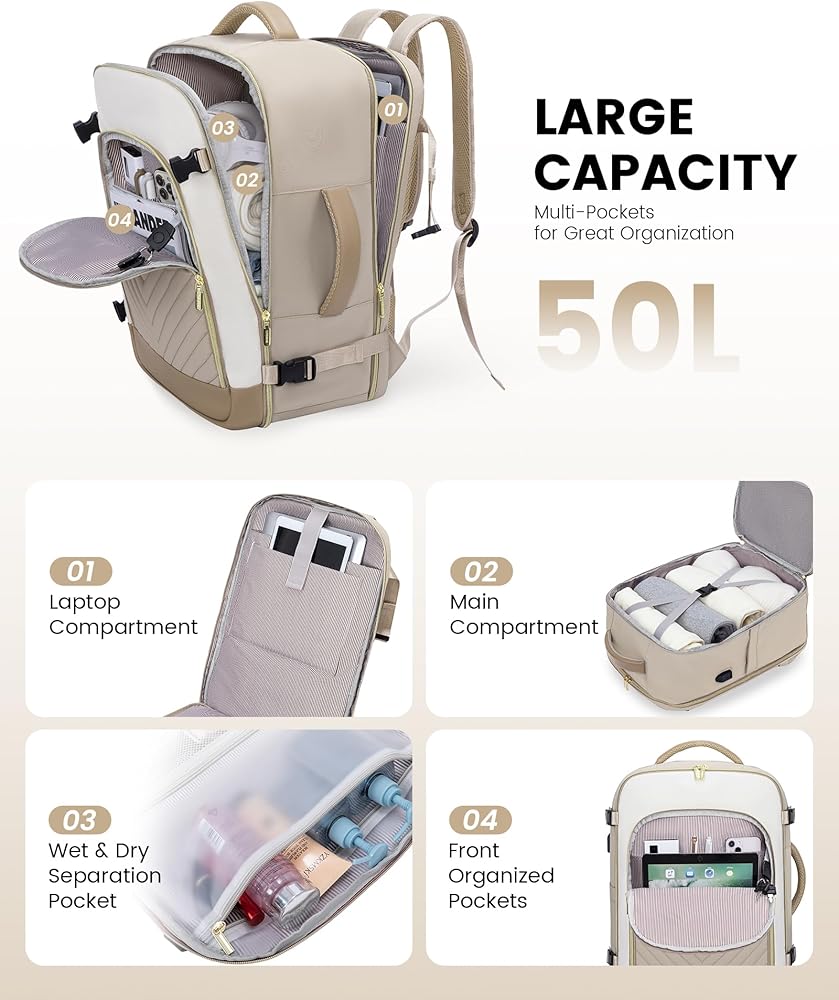حقائب الظهر LoveVook كبيرة للسفر للنساء ، 50 لتر تحمل على ظهر الطائرة المعتمدة ، حقيبة سفر TSA الشخصية للنساء لتناسب 18 "كمبيوتر محمول ، ومقاوم للماء على أكياس للطائرات مع 3 مكعبات التعبئة ...