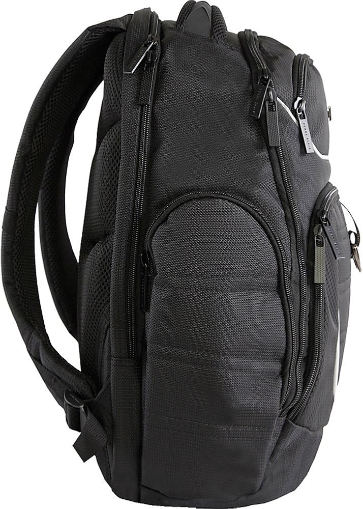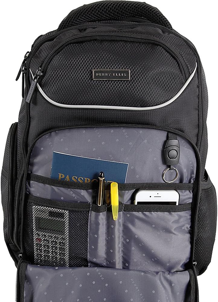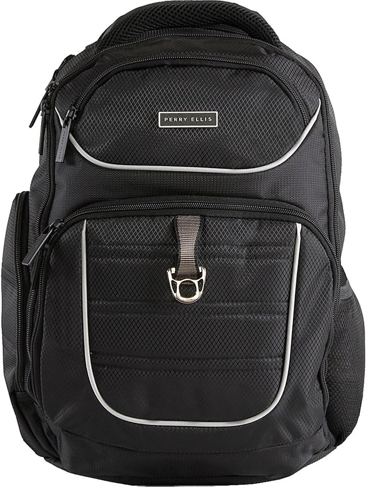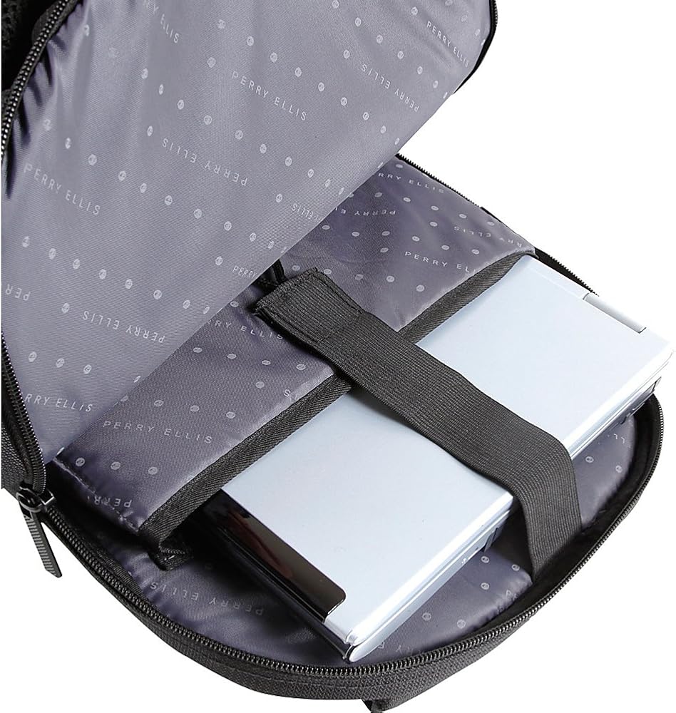 Designed for the business casual traveler in mind, the P13 Perry Ellis Business Laptop Backpack features tablet and laptop sleeves and provides enough room for files and folders for the upcoming meeting. Two separate main compartments for folders and documents, two small exterior pockets for accessories, and one front zippered pocket house a deluxe internal organizer for ultimate organization capability. Connect your headphones or charger to your tablet through the cord passages featured for the tablet zippered pocket. Travel in comfort with the thick padded top handle, adjustable shoulder pads, and vertically design back panel.