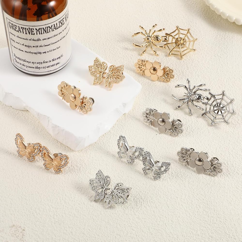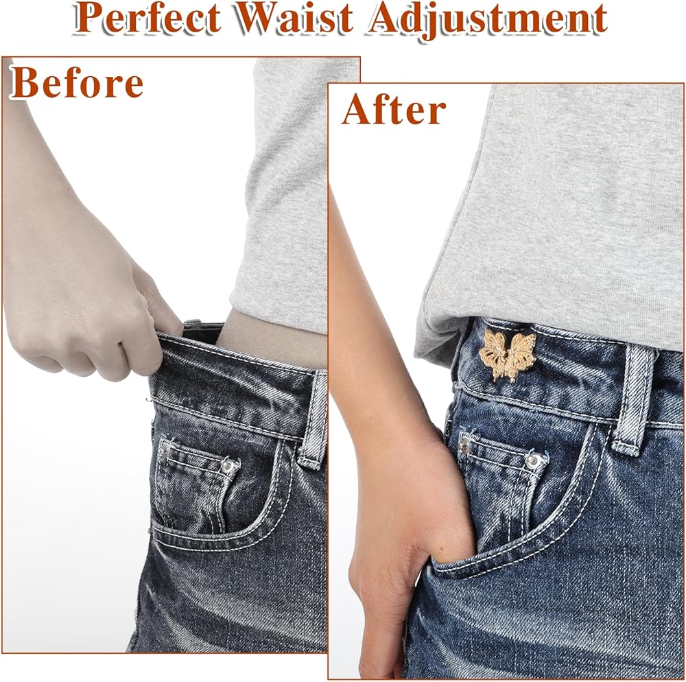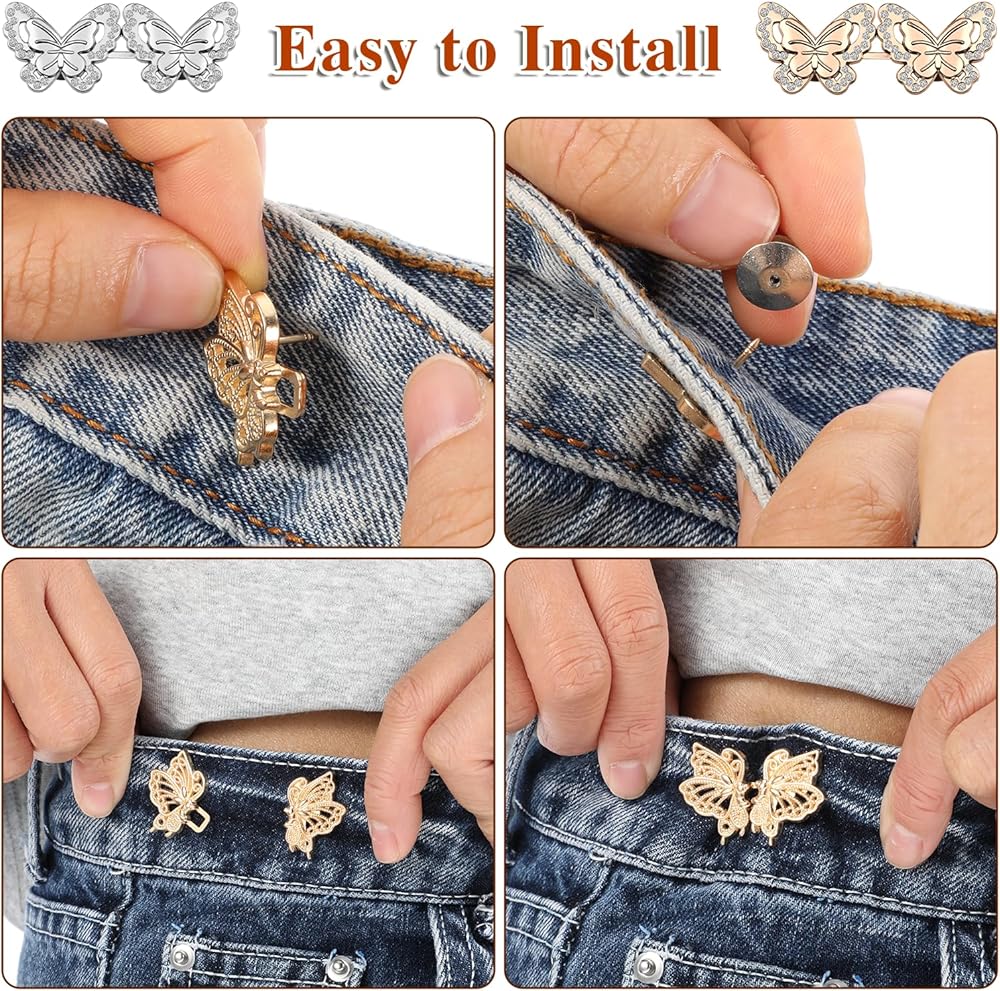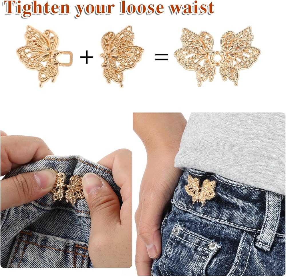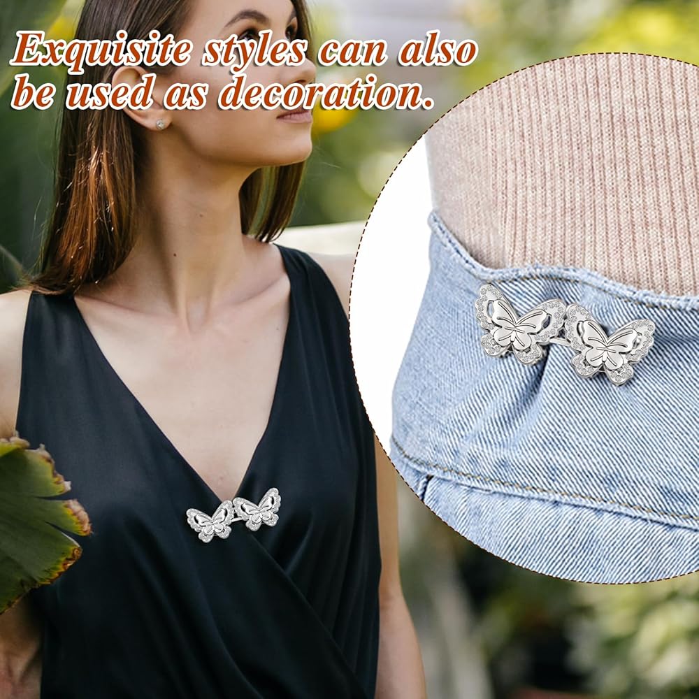 Qianyu 10 Sets Pant Waist Tightener Metal Butterfly Jeans Buttons Pins for Loose Jeans Crystal Pants Adjustable and Detachable Decorative Waist Buckles No Sew Waistband Tightener to Make Smaller