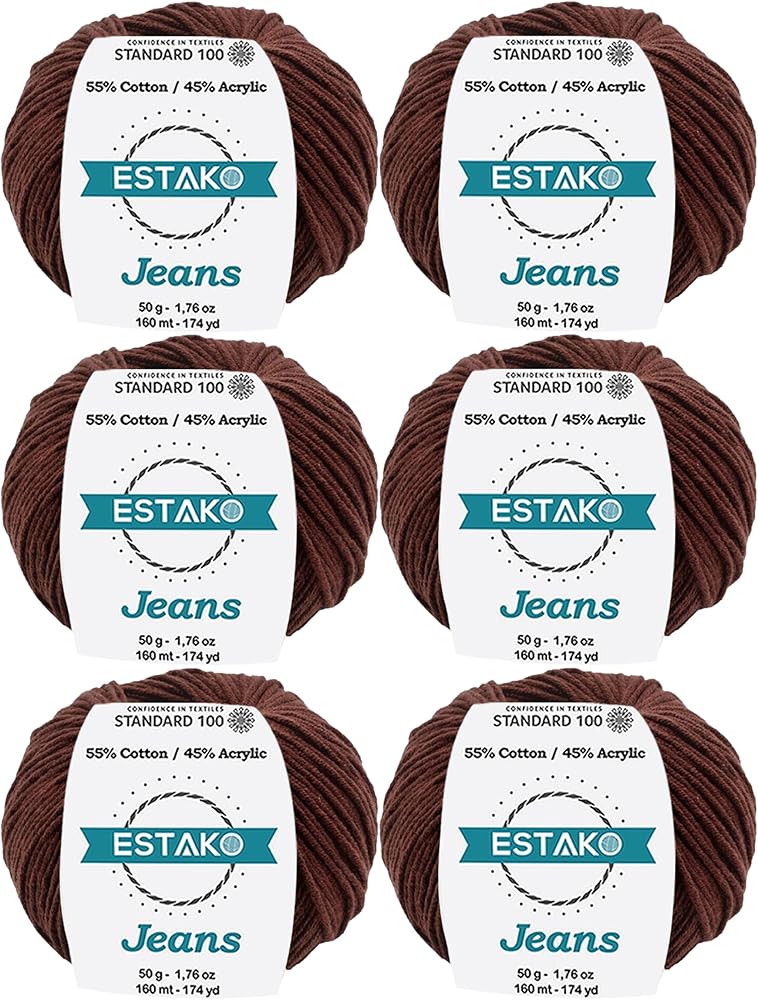 Estako Jeans, 55% Cotton 45% Acrylic Yarn, Soft, Fine / Sport (2) for Crochet and Knitting 1.76 Oz (50g) / 174 Yrds (160m) Weight : Fine / Sport (2) Estako Jeans Knitting Yarn contain great blend of 55% cotton and 45% premium acrylic to use in all sort of baby garment projects without any doubt.Regular thickness of Jeans allow to knit with both pins and hook. Great for create unique baby garment designs and amigurumi dolls Suitable for 2.5 - 4 mm (US 2 - 6 ) (UK 11-8) needle size (Knitting) or 2.5 - 3.5 mm / US B-1 - D-3 (UK 13-11) (crocheting) EASY TO WORK WITH: Cotton is a soft fiber that grows around the seeds of the cotton plant. Cool, soft and comfortable, cotton is presently the world's most used fiber. CERTIFIED, DURABLE, AND ECO-FRIENDLY: The yarn is CERTIFIED as STANDARD 100 by OEKO-TEX to be FREE from Harmful Chemicals and Artificial Synthetics.