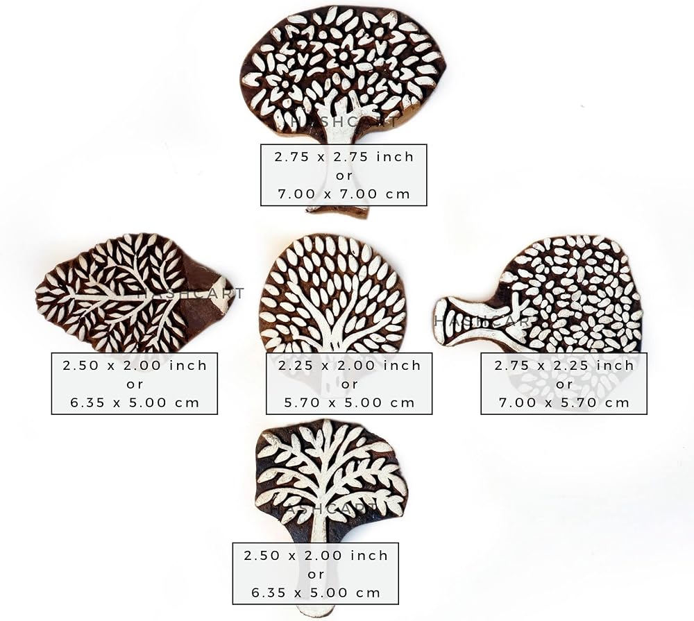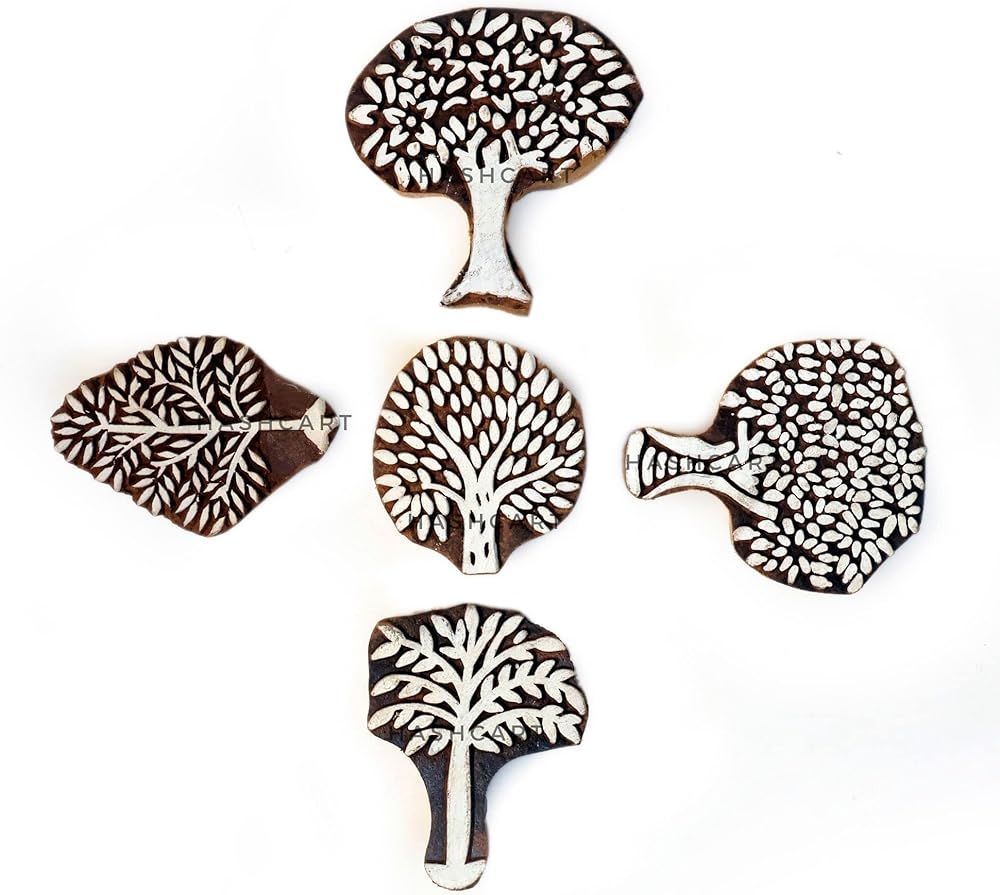 Hashcart® Wooden Pottery Stamps for Block Printing Syng Tree Design Stamps (مجموعة من 5) - طوابع كتلة خشبية لصياغة النسيج والوشم الطين والحمناء