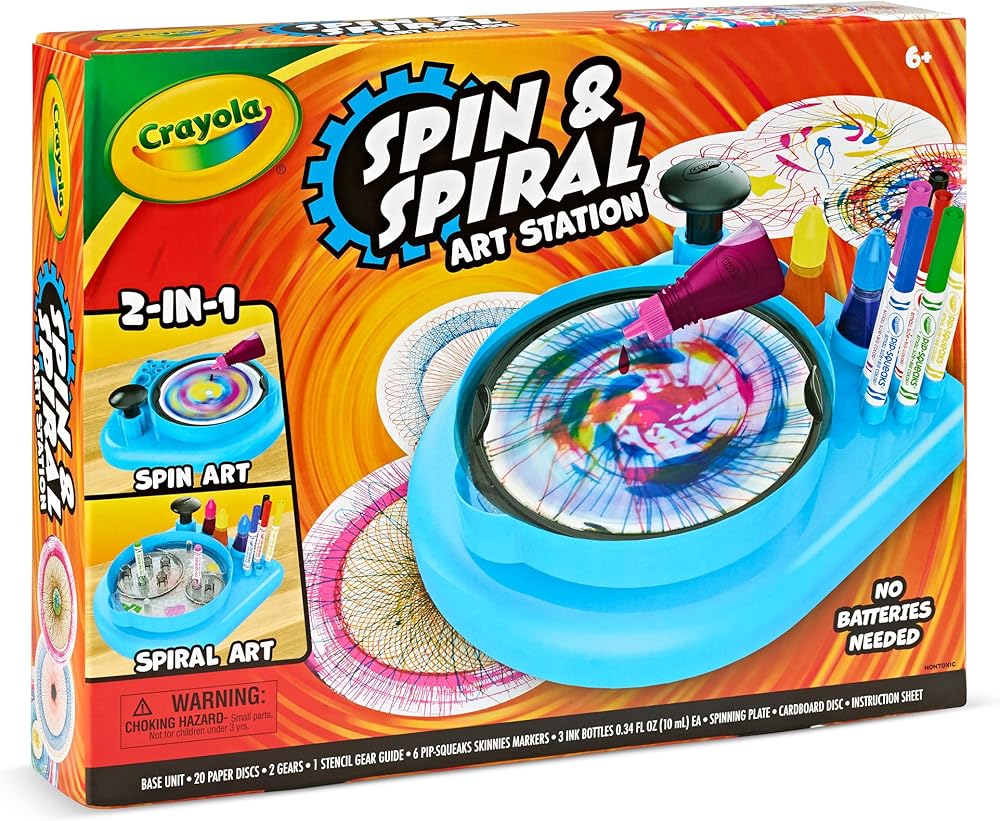 Creative girls and boys will delight in the chance to make spin & spirograph art powered by hand! A sleek & enhanced design make this Spin & Spiral Art Station easier for kids to use and more portable than ever. Its unique 3-in-1 Super Gear helps kids with their spiral art, while allowing them to use all 6 markers at once. Plus, the ability to create spin and spiral art on one base, means this toy takes up less space while being easier to store. Featuring over 30 art supplies including the base unit, 20 Paper Discs, 2 Gears, 6 Pip Squeaks Skinnies Markers, and 3 Ink Bottles, everything needed to get started creating is ready right out of the box. Plus, there are convenient guides that make it easy for kids to get crafting without a struggle! This art kit focuses on spin and spiral art activities, embracing kid-powered crafts that are fun and easy. While all the supplies needed to complete the art projects are in the box, when kids are ready for paper refills, your standard paper plates will work perfectly. This art kit is a creative gift for boys and girls, ages 6 & up. Give kids an effortless way to enjoy two classic art activities with one battery-free toy!