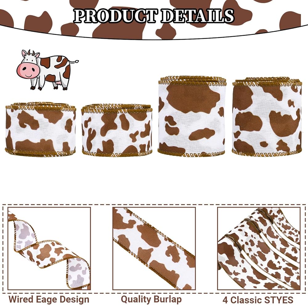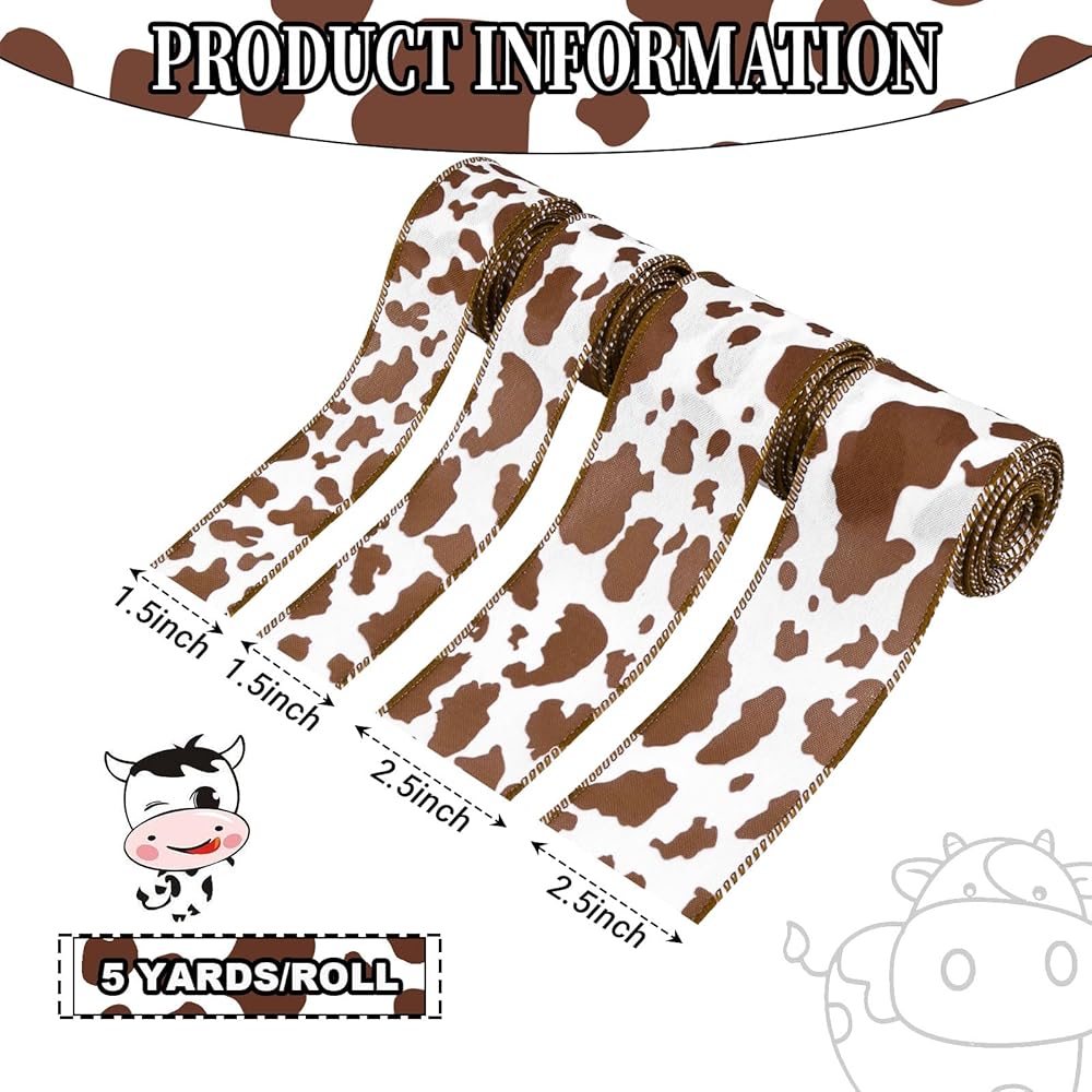 【Abundant Quantity】: Package includes 4 rolls wired edge ribbons in 4 different cow spot patterns, 2 rolls are in 5 yard x 2.5 inch, another 2 rolls are in 5 yard x 1.5 inch, enough length and multiple width could meed your multiple DIY needs. Cute cow spot patterns printed, perfect for you to DIY some wreath crafts or use for gift wrapping.
