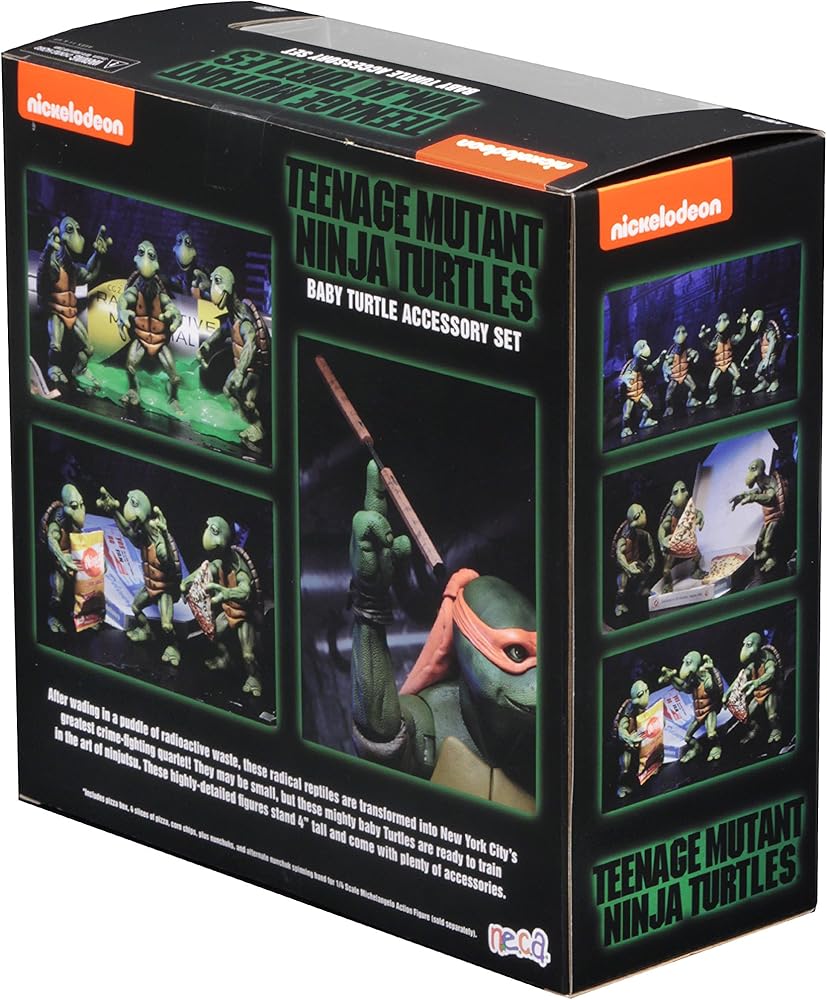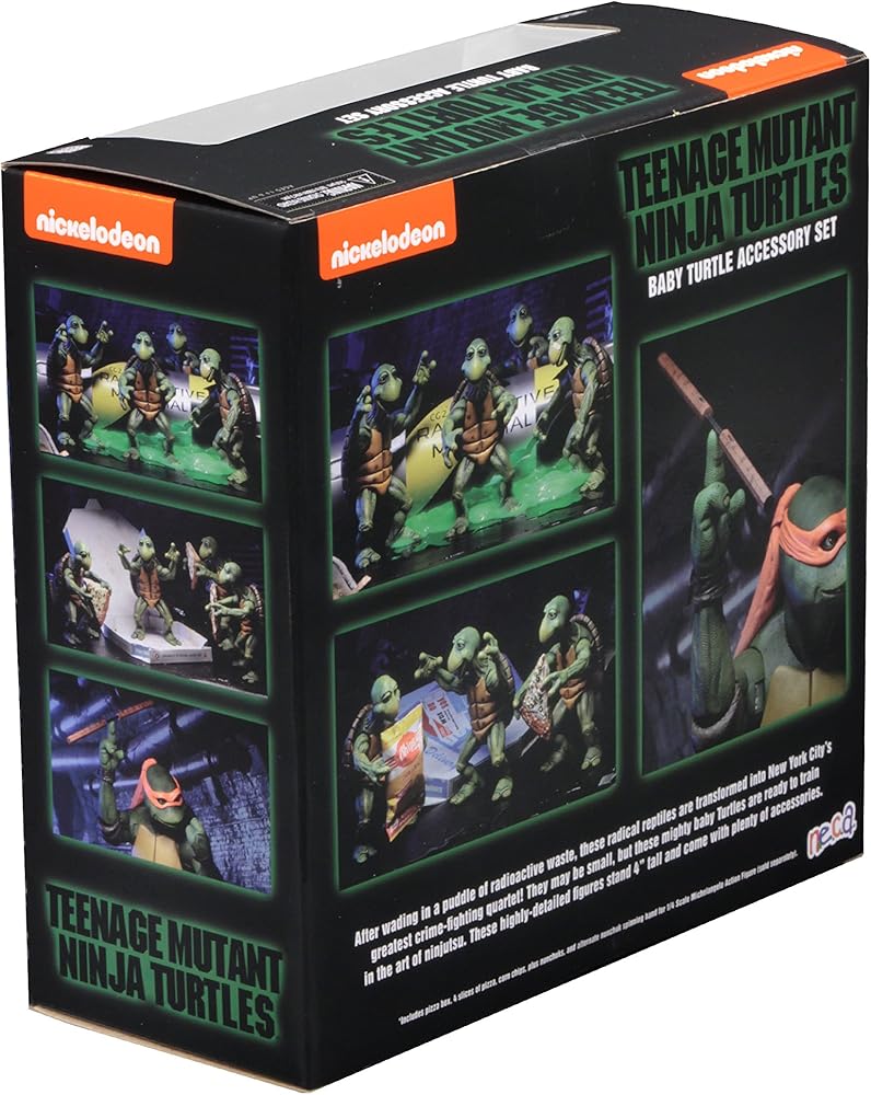 After wading in a puddle of radioactive waste, these radical reptiles are transformed into New York City's greatest crime-fighting quartet! The Baby Turtles are still tiny but ready to train with their master Splinter. These detailed, poseable figures stand 4” tall, making them perfectly in scale with NECA's 1/4 scale TMNT action figure line, and they come with plenty of accessories. The set includes 4 Baby Turtles, pizza box, 4 slices of pizza, and bag of corn chips, plus a cool bonus—nunchuks and alternate nunchuk-spinning hand for NECA's 1/4 Scale Michelangelo Action Figure (sold separately). Window box packaging.