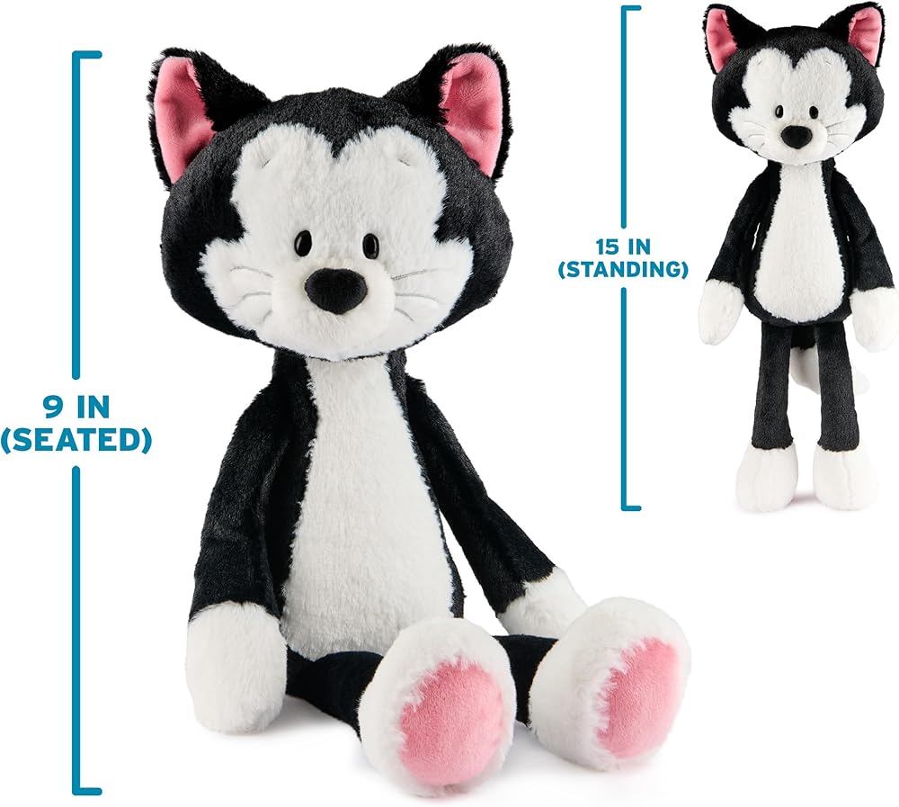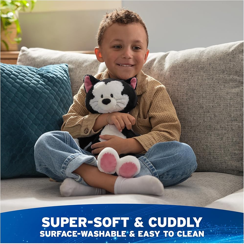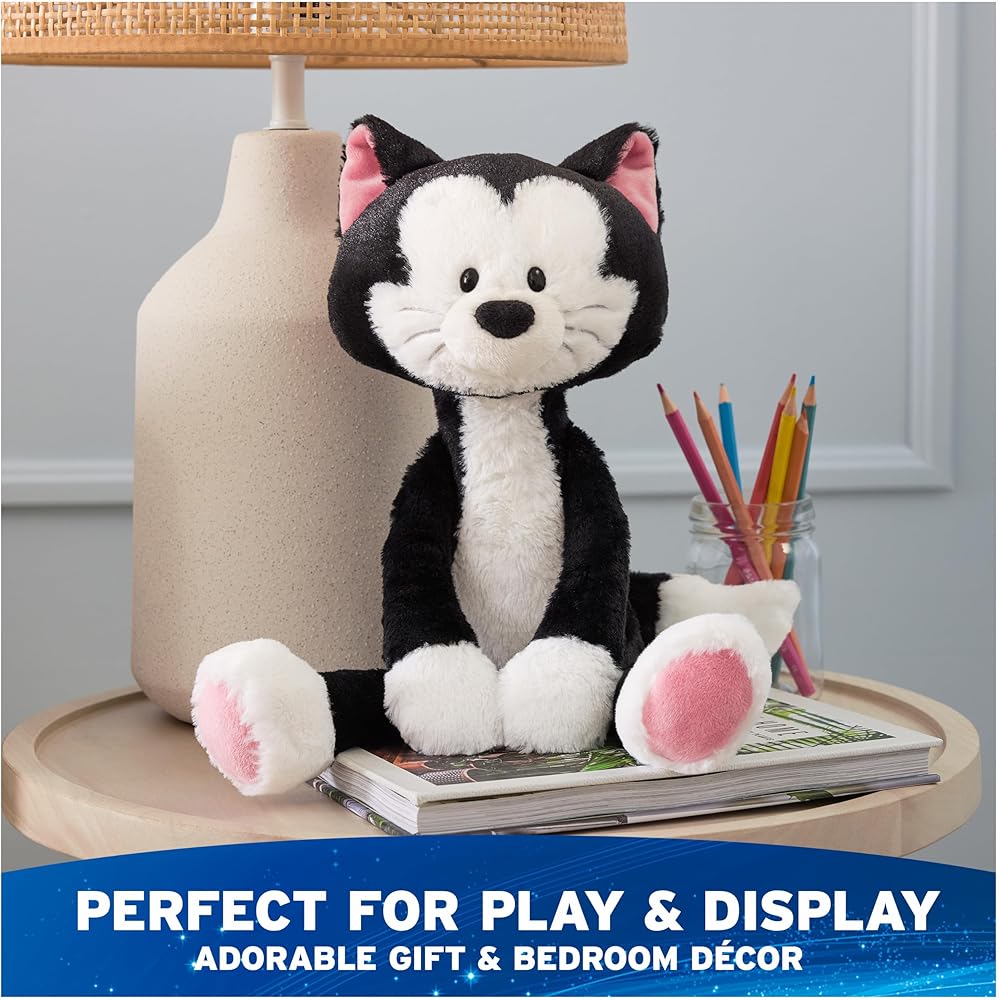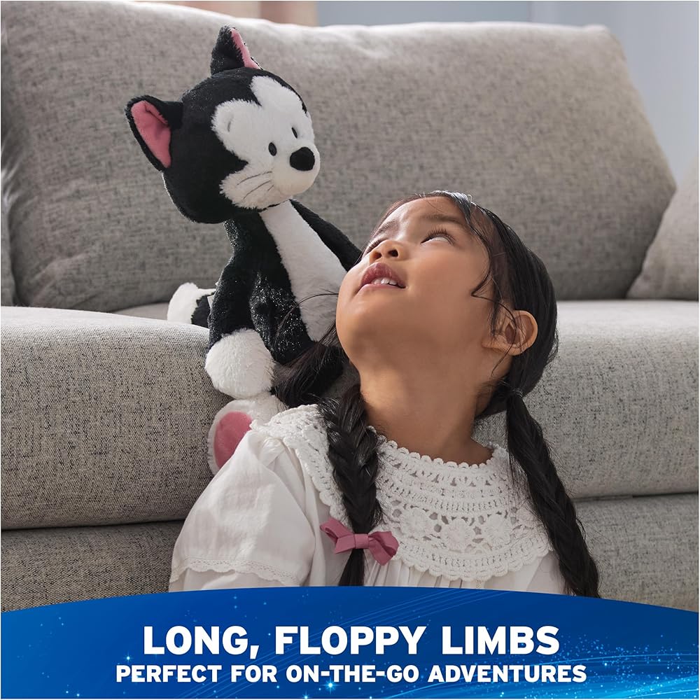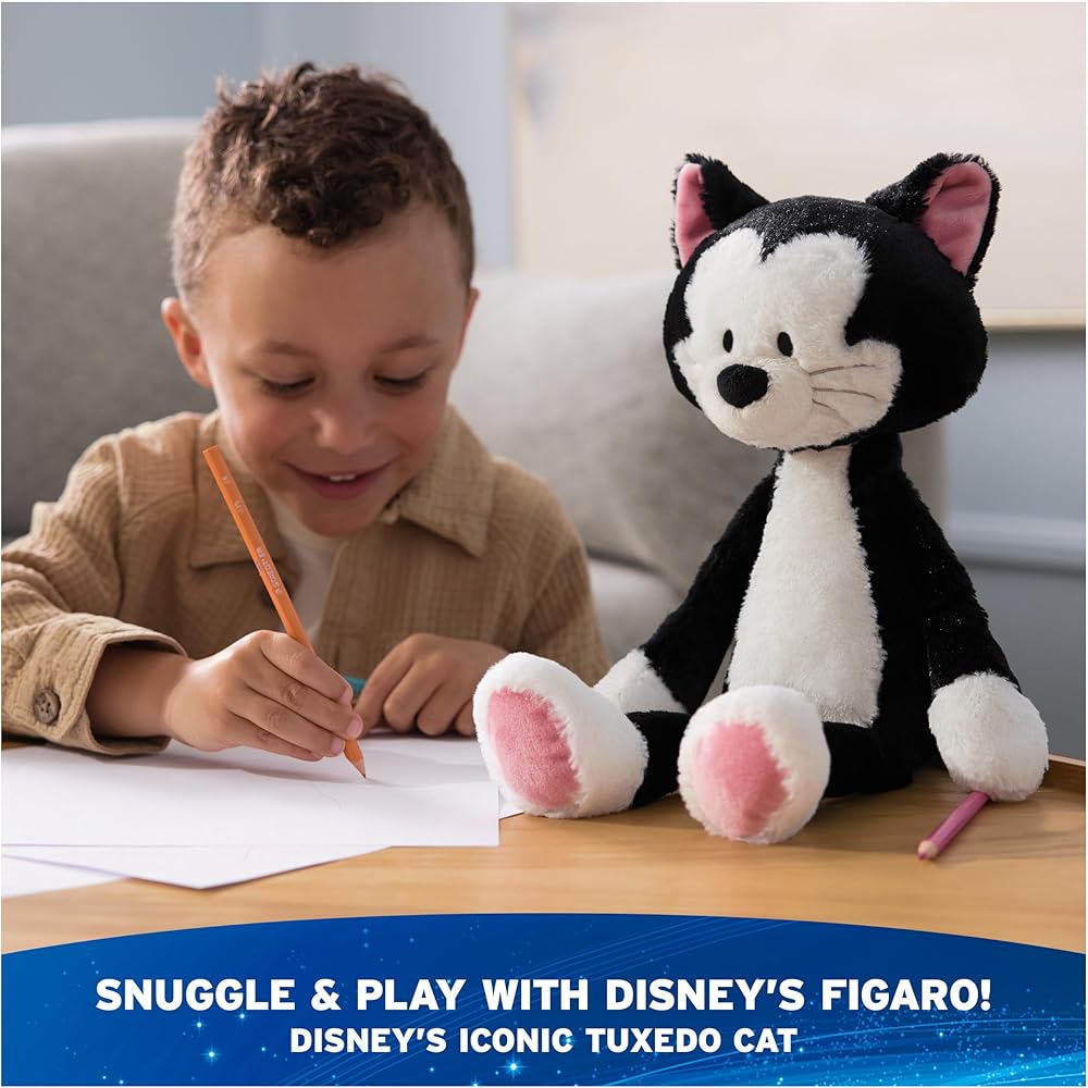 TOOTHPICK FIGARO PLUSH: This soft, huggable tuxedo cat stuffed animal features authentic character details from Disney classics, including soft black-and-white plush, a fluffy tail, silver embroidery, and pink accents on his feet and ears